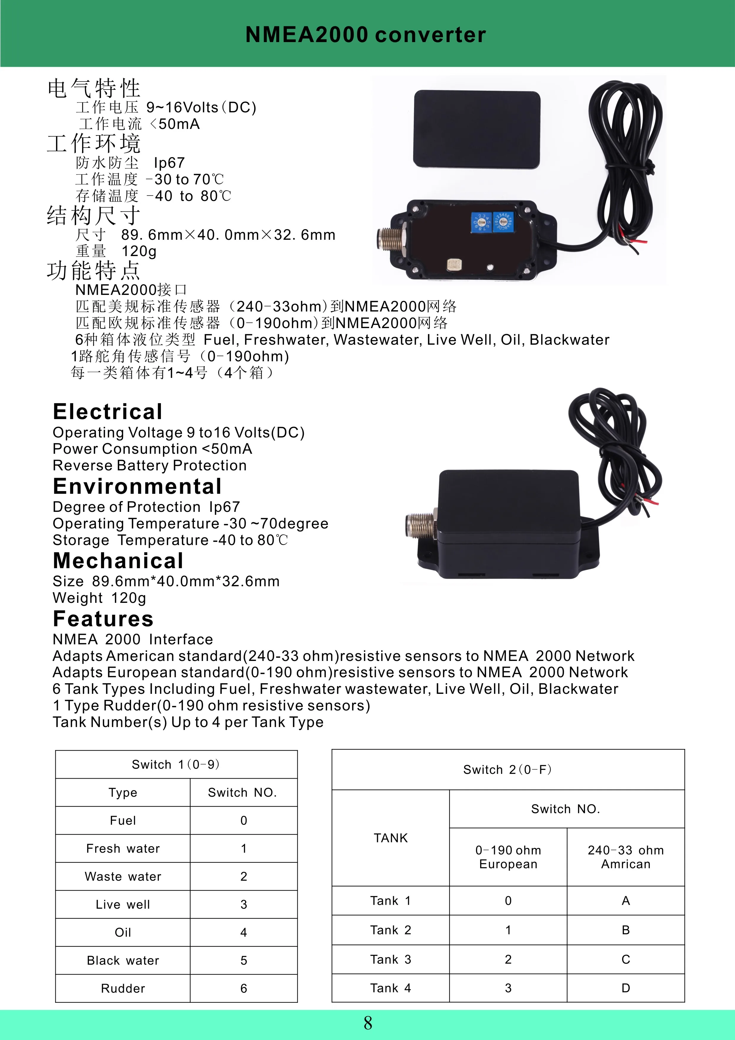 0-190ohm/240-33ohm Sensore di livello del carburante Calibro del serbatoio per yacht per barche marine Convertitore NMEA2000 CX5001Adatto per indicatori di livello del carburante automatici da 9-32 V