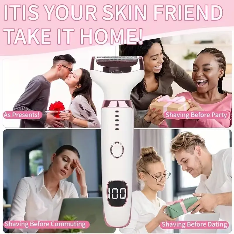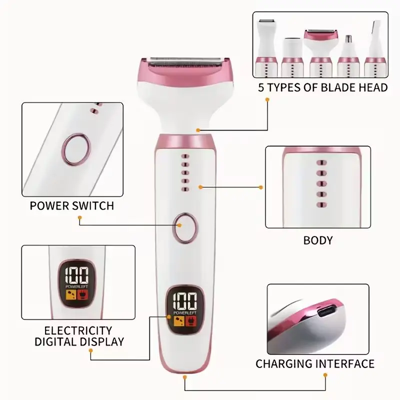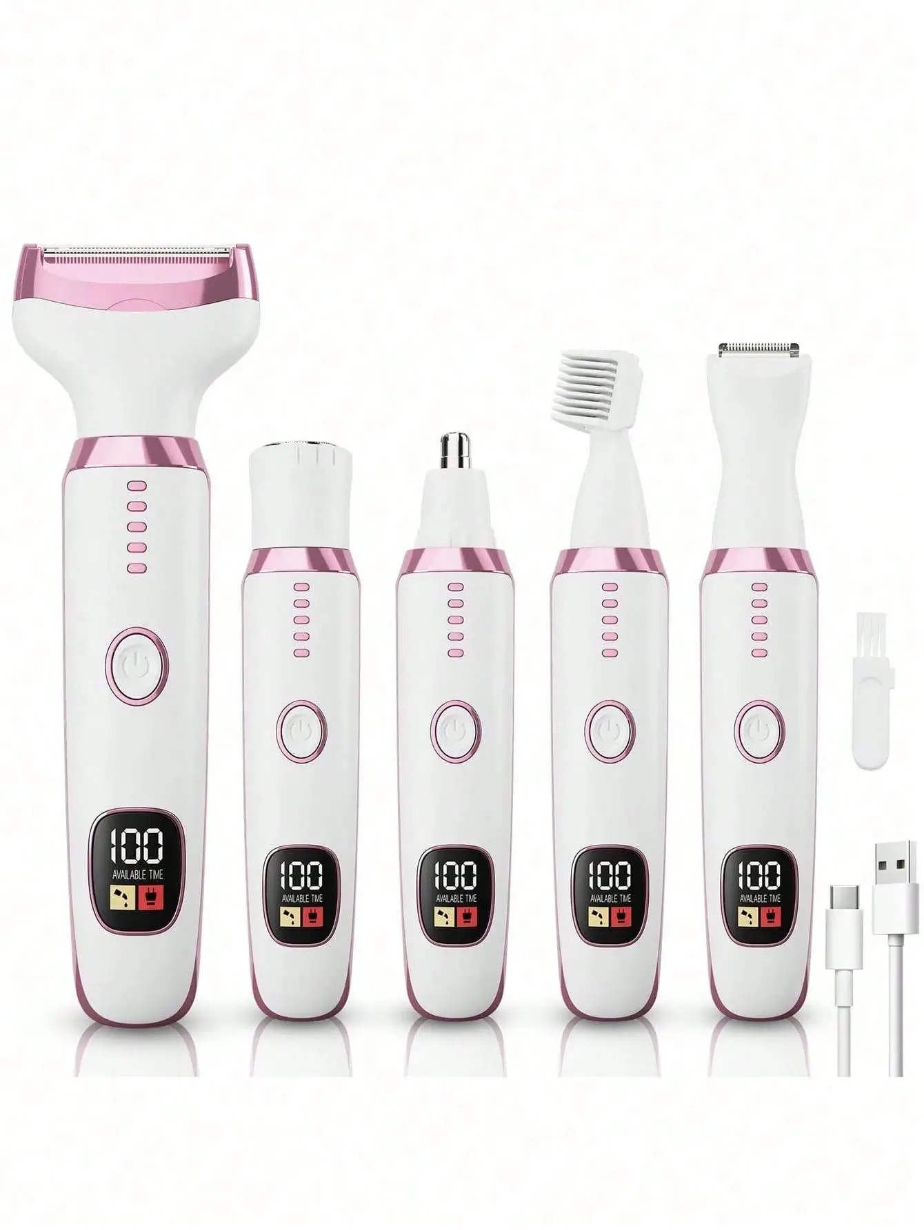 Nuovo Rasoio Elettrico Ricaricabile 5-in-1 per Donna - Display LED, Trimmer per Gambe e Ascelle, Depilatore in Acciaio Inox per Uso Bagnato e Asciutto