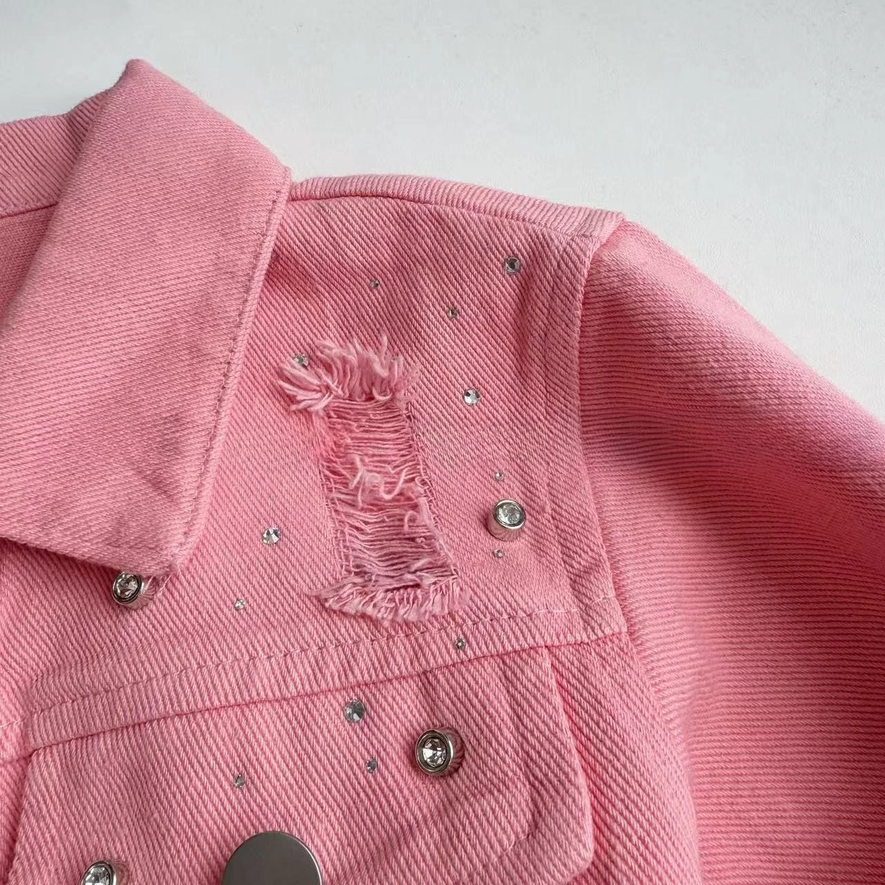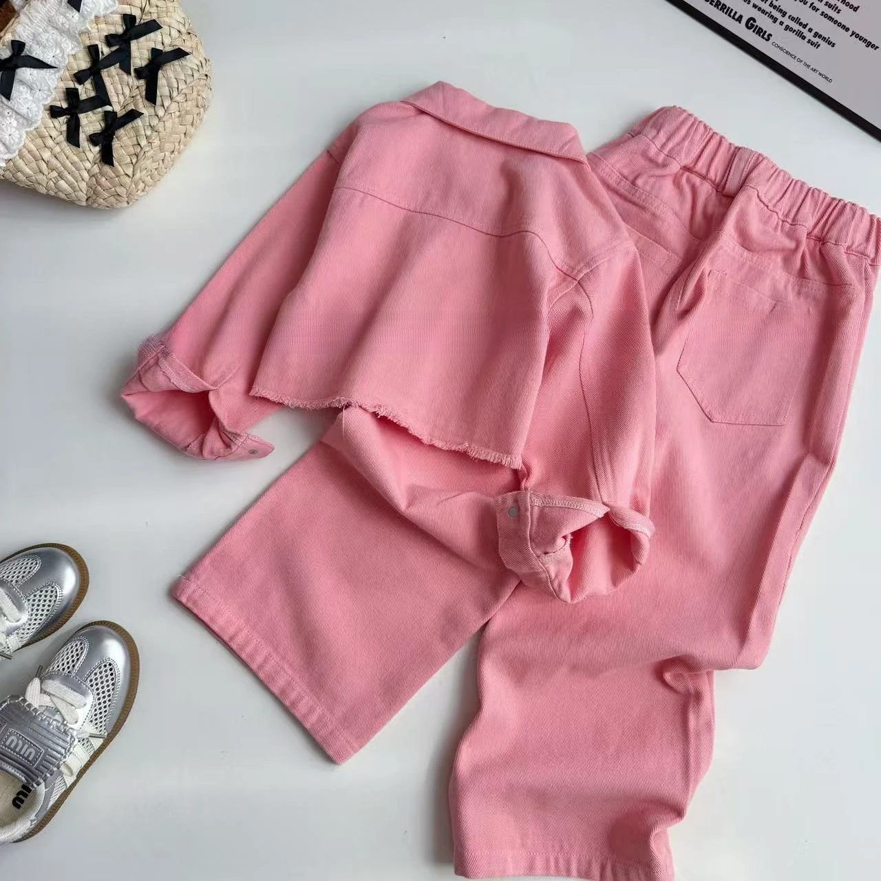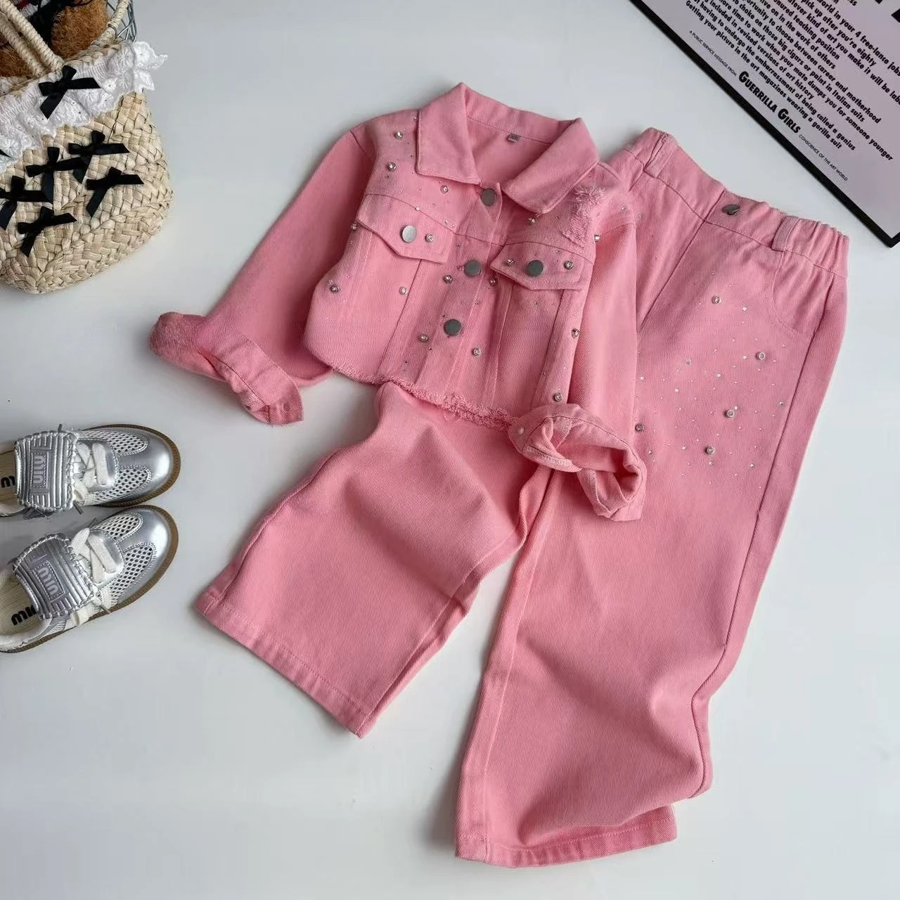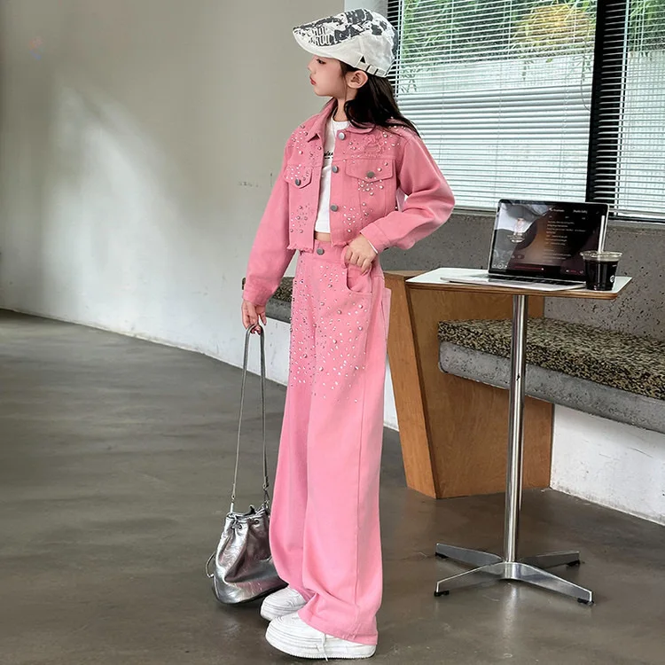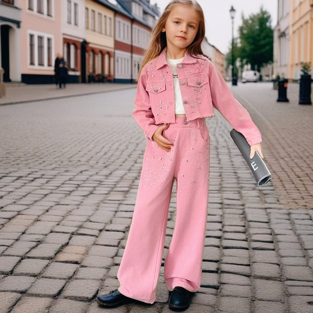 Completo Primaverile 2026 per Ragazze: Set in Denim con Giacca Corta Rosa con Strass e Pantaloni a Gamba Larga, Moda Casual Due Pezzi per Adolescenti