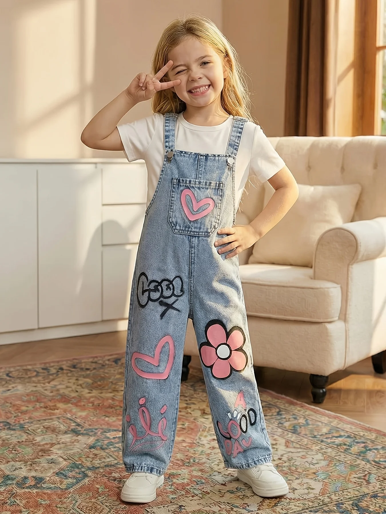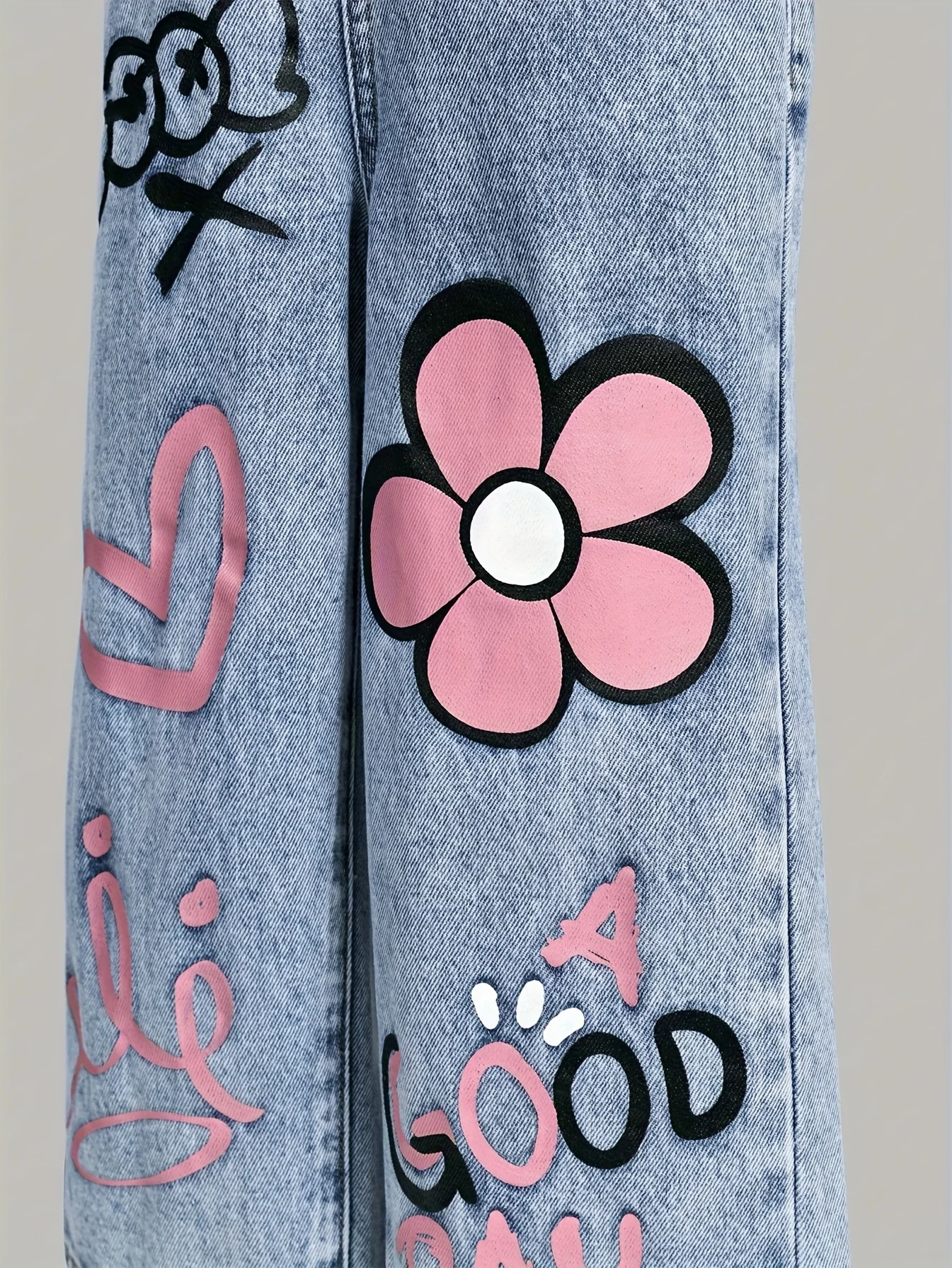 Pantaloni da ragazza con motivo floreale, a forma di cuore e graffiti arcobaleno, casual e comodi, con coulisse in denim streetwear Y2K.