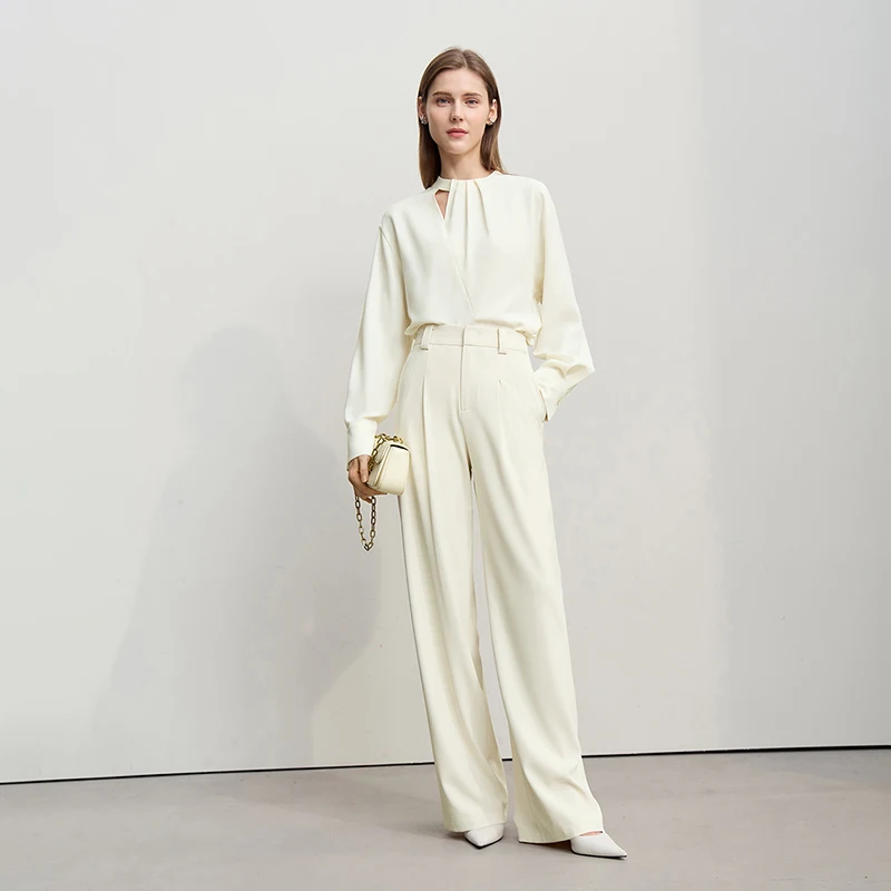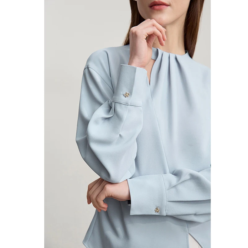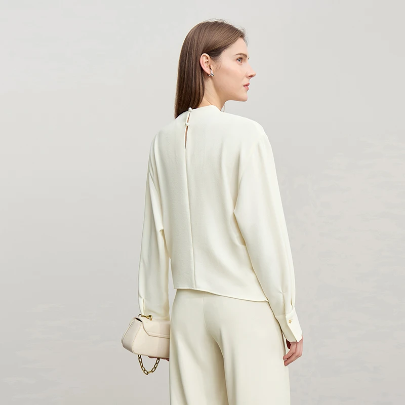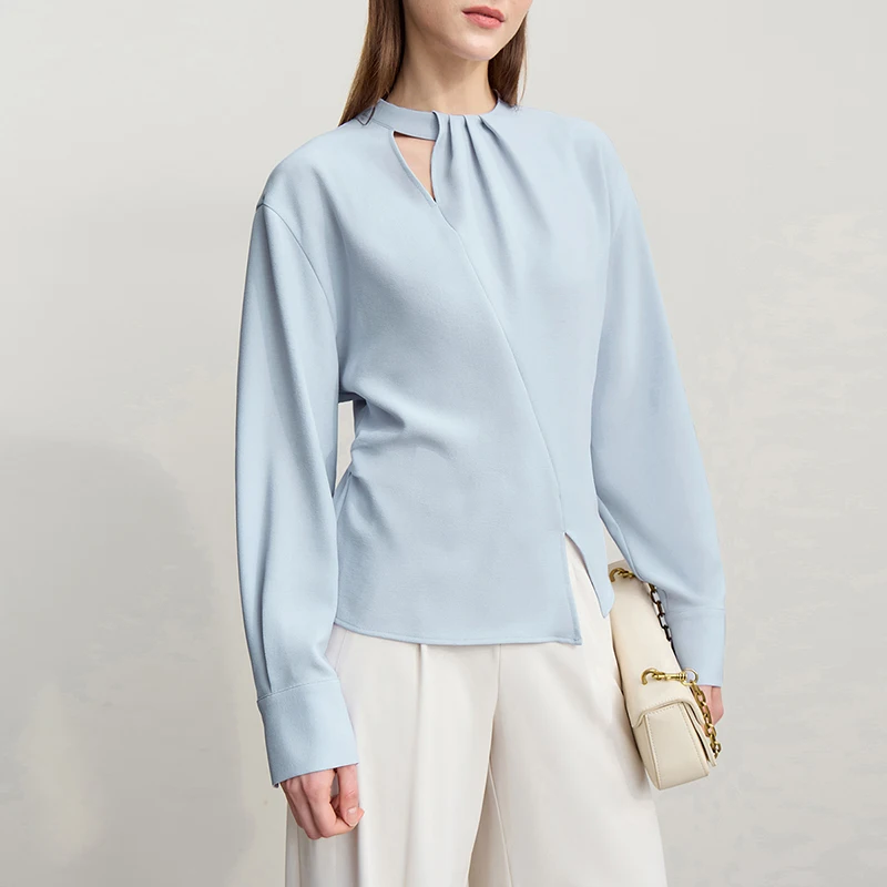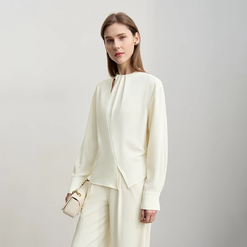 Camicetta da Donna Amii 2026 Nuova Collezione Primavera Elegante Top da Donna con Scollo a O e Dettagli Vuoti, Camicia in Chiffon Plissettata Asimmetrica con Spacco 12641007