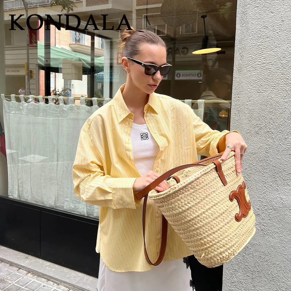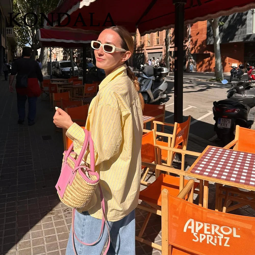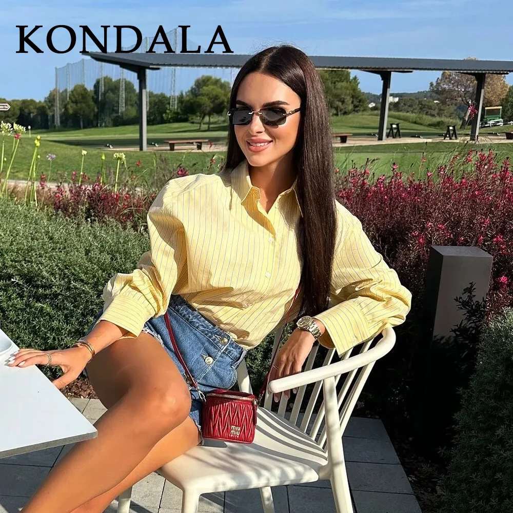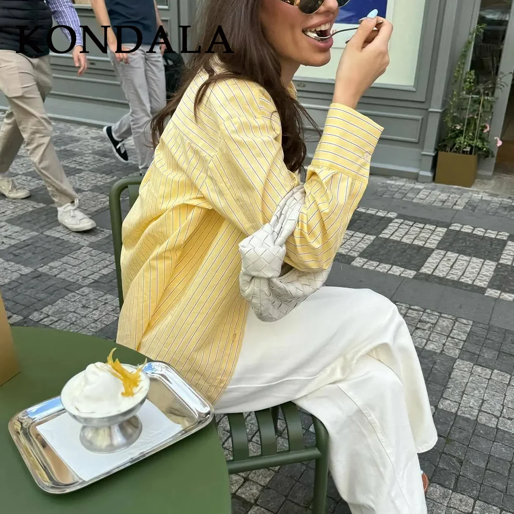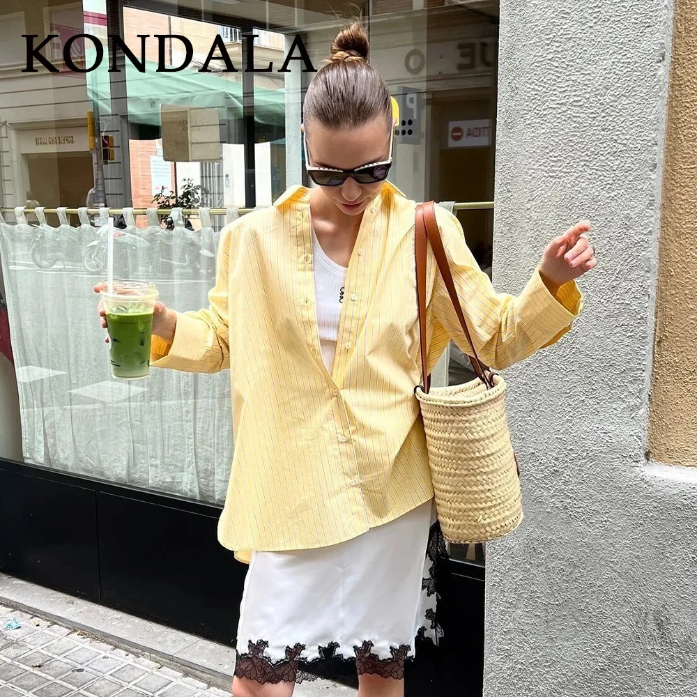 KONDALA 2026 Primavera Estate Camicie da Donna a Righe Giallo Burro, Moda Casual con Colletto Rovesciato e Bottoni, Camicie Sottili da Donna