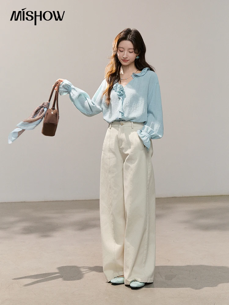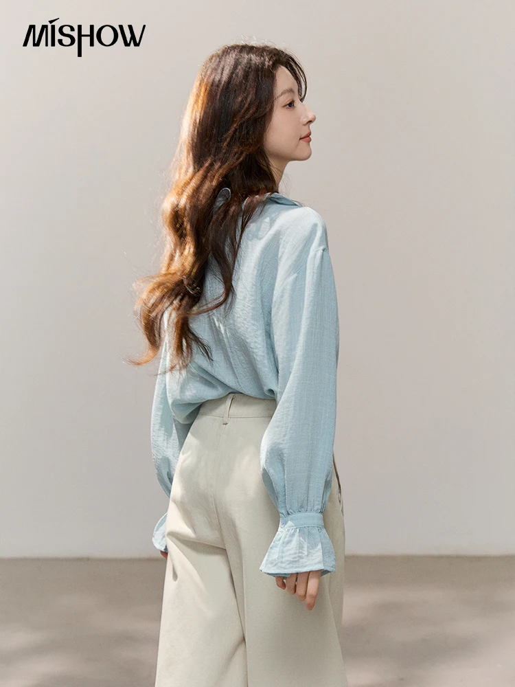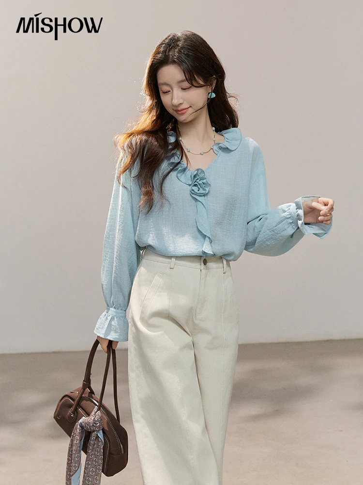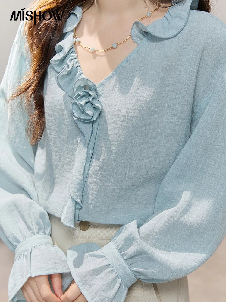 MISHOW Camicia da donna asimmetrica con scollo a V e volant, blusa primaverile azzurra con applicazioni floreali e polsini a balze, elegante e ampia MXF14C2448