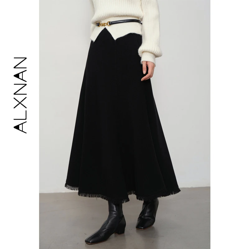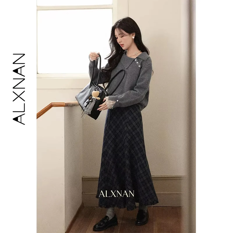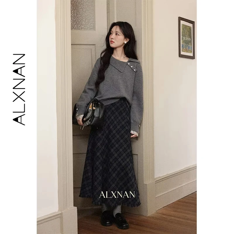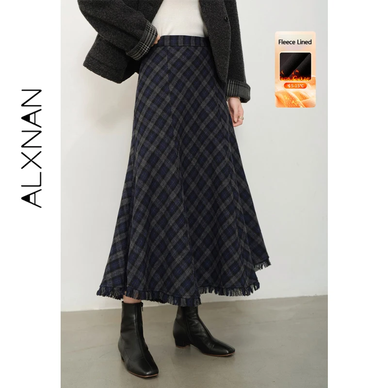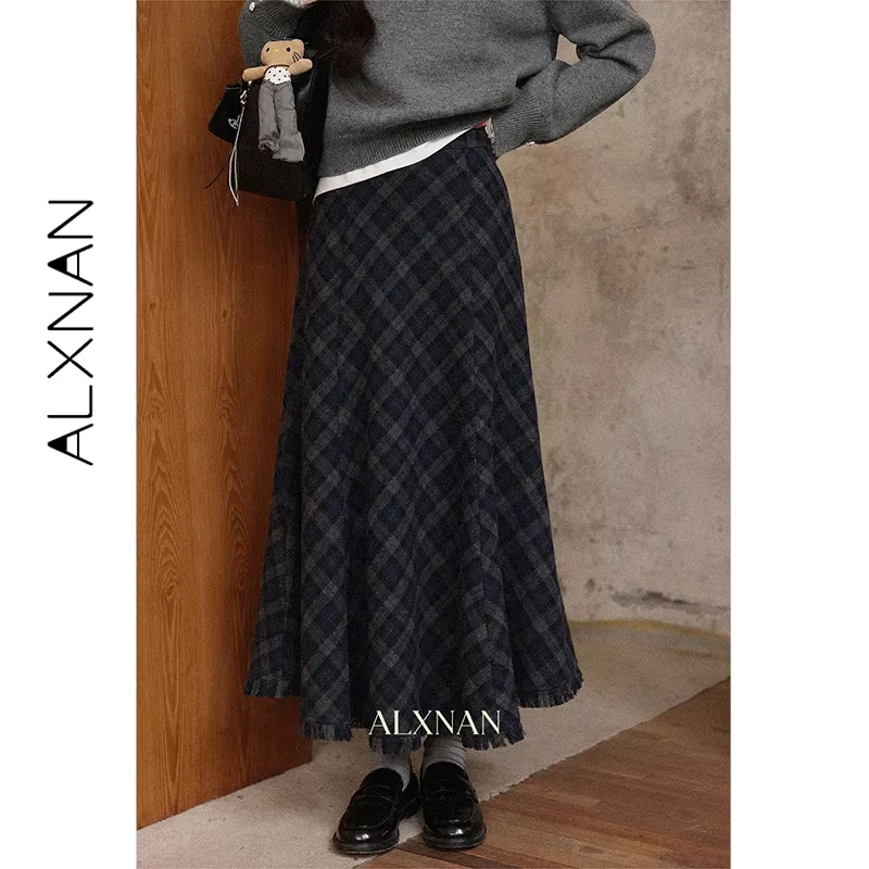 ALXNAN Gonna scozzese grigia a vita alta Gonna lunga a coda di pesce a quadretti a trapezio Autunno Casual Office Lady Elegante gonne con nappe L57318