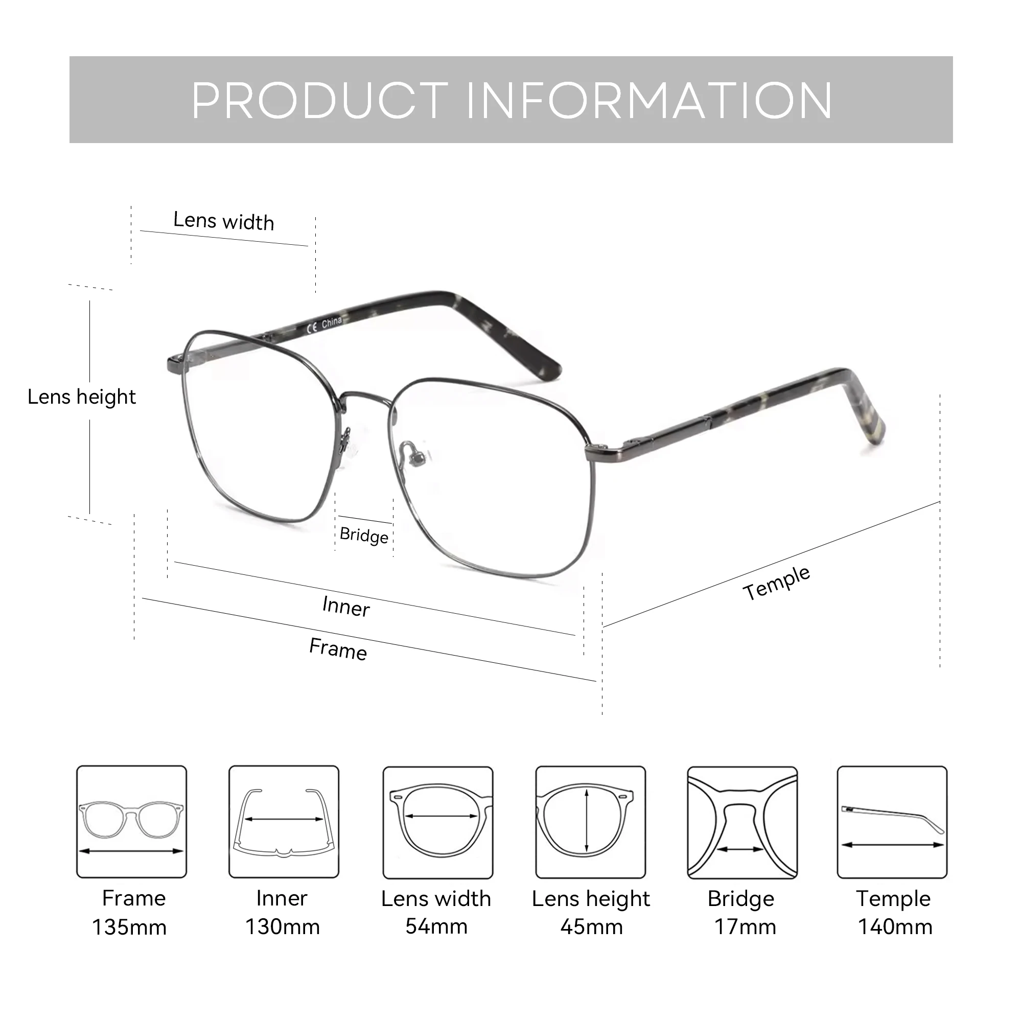 Linijki widocznej na zdjęciu nie można używać do pomiaru starych okularów.Użyj narzędzia pomiarowego, aby sprawdzić rozmiar starej pary okularów.(akceptowalna różnica 2-3mm)