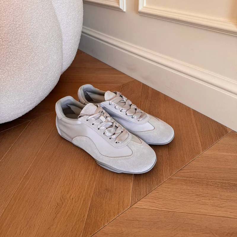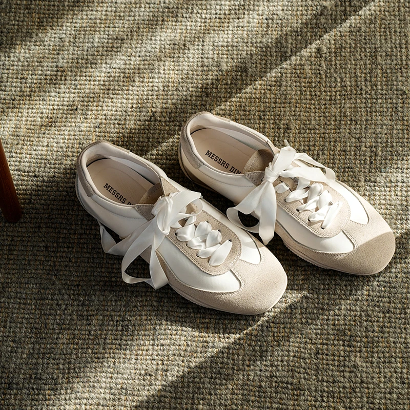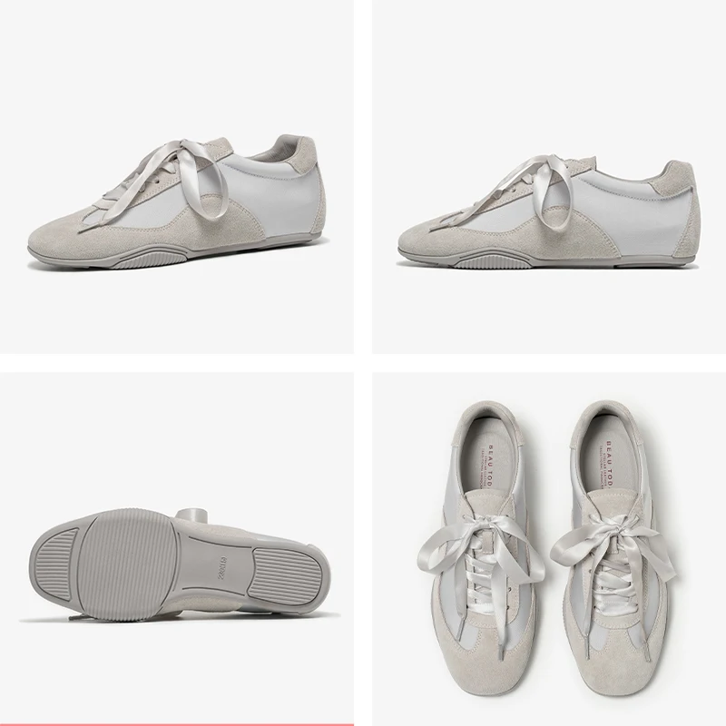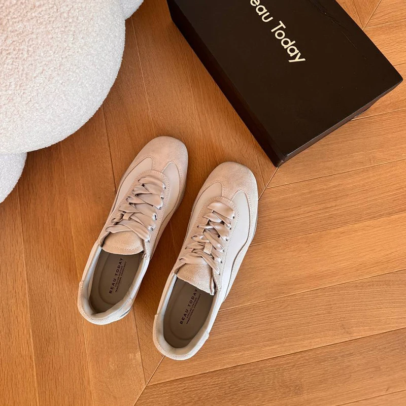 BEAUTODAY Damskie buty treningowe ze skóry zamszowej, patchworkowe baletki, sznurowane wstążką, damskie baleriny na boso, ręcznie robione 29925
