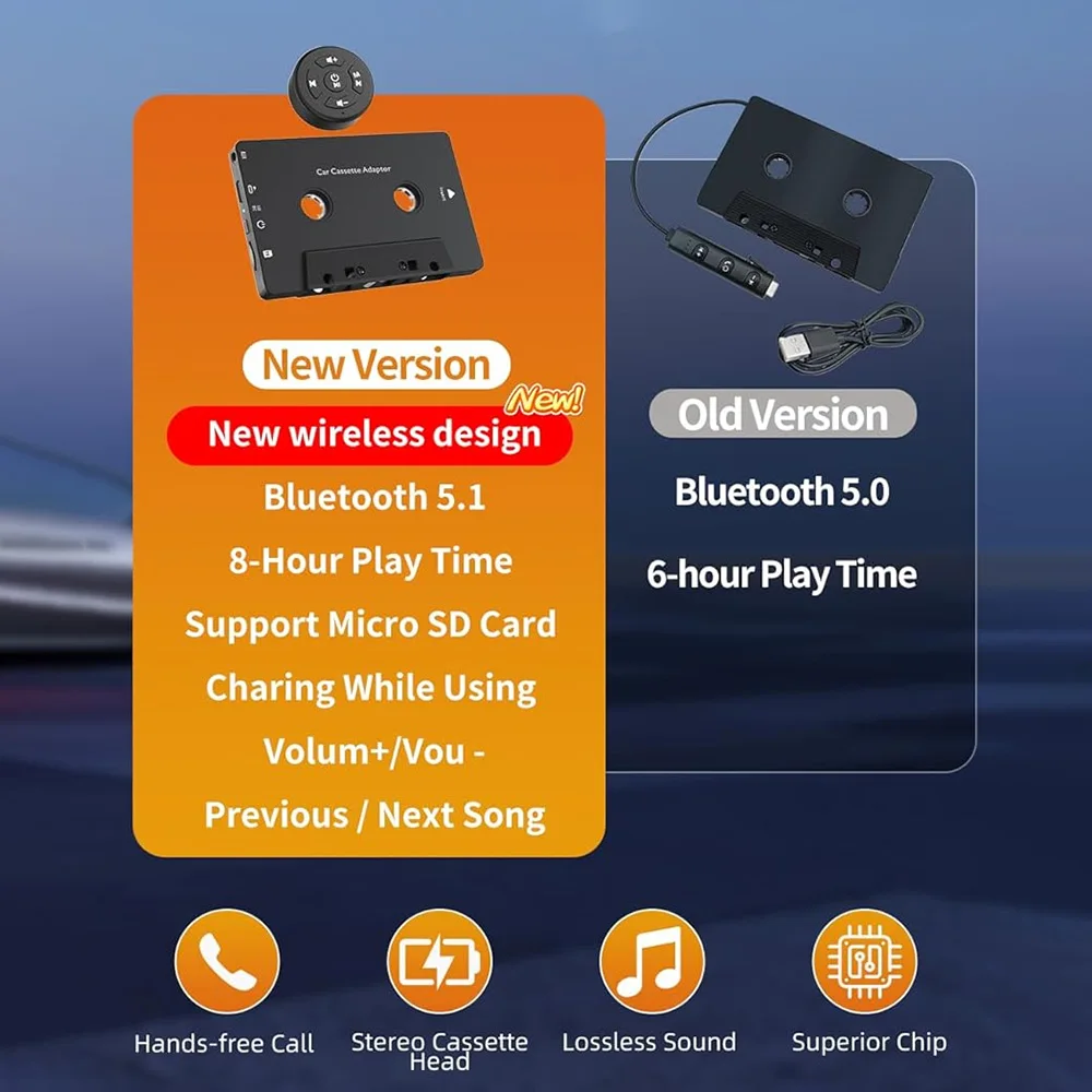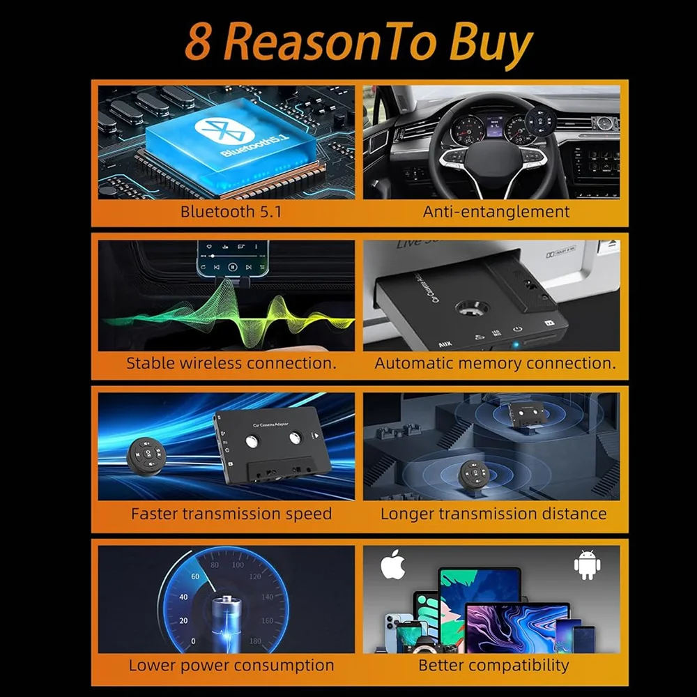【Klasyczny samochód i nowoczesna wygoda】 Jeśli masz samochód zabytkowy z magnetofonem, odbiornik kasetowy Bluetooth pozwoli Ci nadal cieszyć się muzyką i łatwymi rozmowami telefonicznymi!Nie musisz wymieniać ani przerabiać swojego samochodu, aby zachować jego oryginalny, klasyczny wygląd.