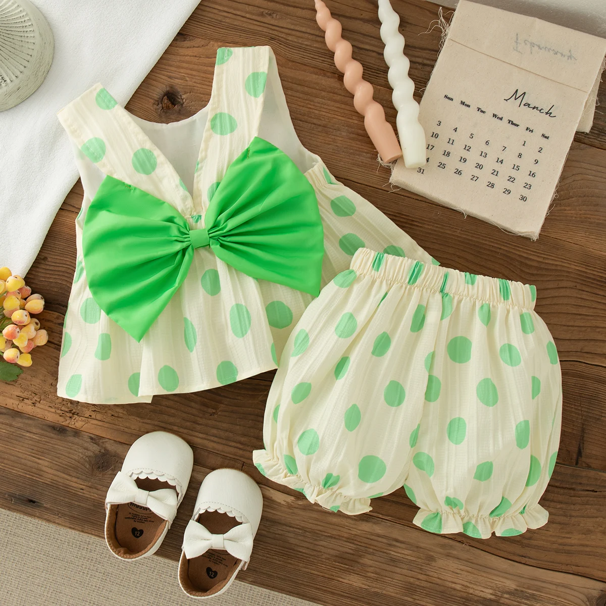 Zestaw dla małych dziewczynek 2-częściowy w stylu koreańskim z kokardką w kropki bez rękawów i spodenki dla noworodków na lato z bawełny na co dzień do zabawy