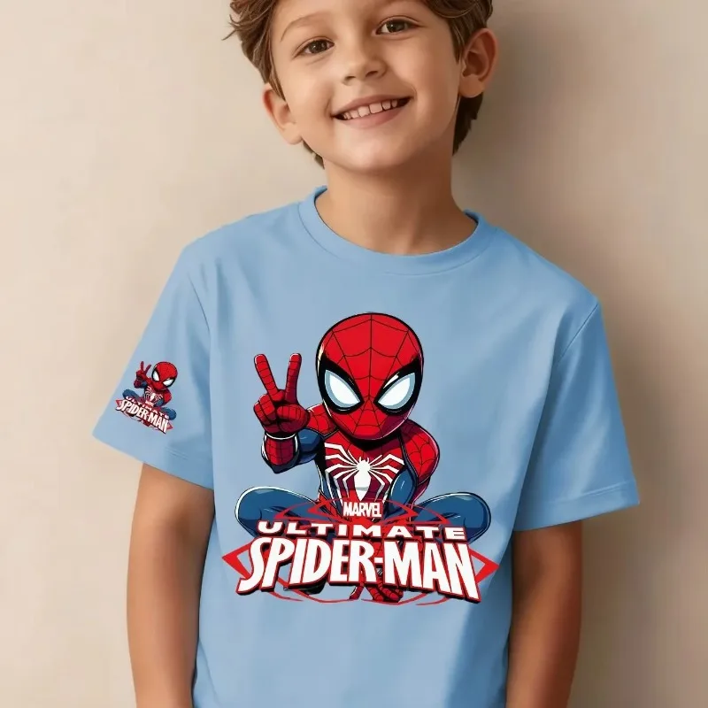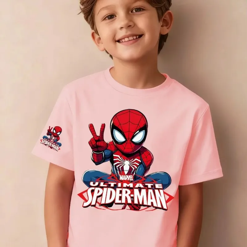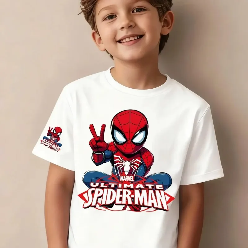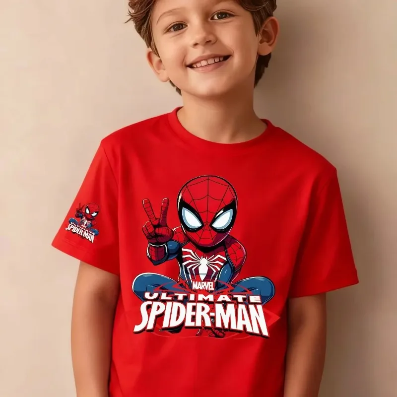 Letnia koszulka dziecięca, modna i stylowa, z nadrukiem Spider-Mana, z czystej bawełny, z okrągłym dekoltem, zestaw dla rodziców i dzieci, z krótkim rękawem.