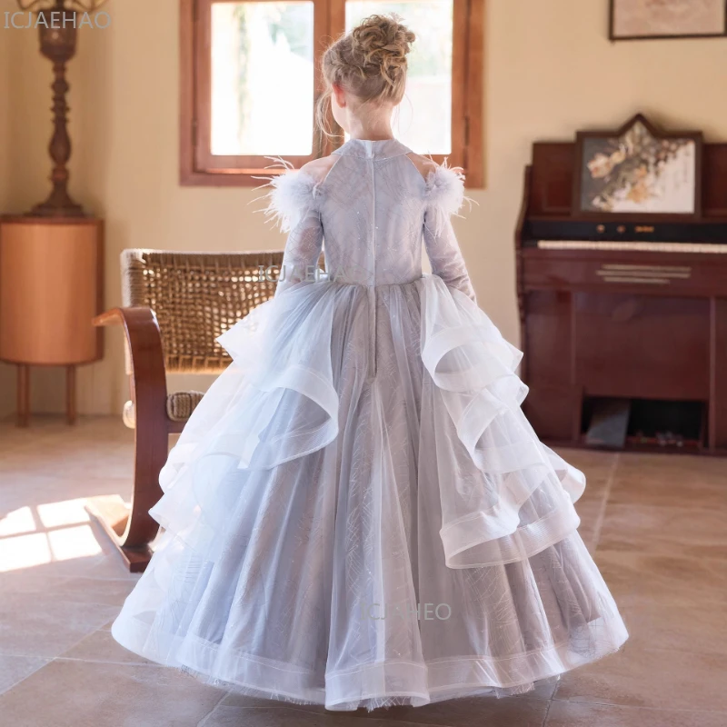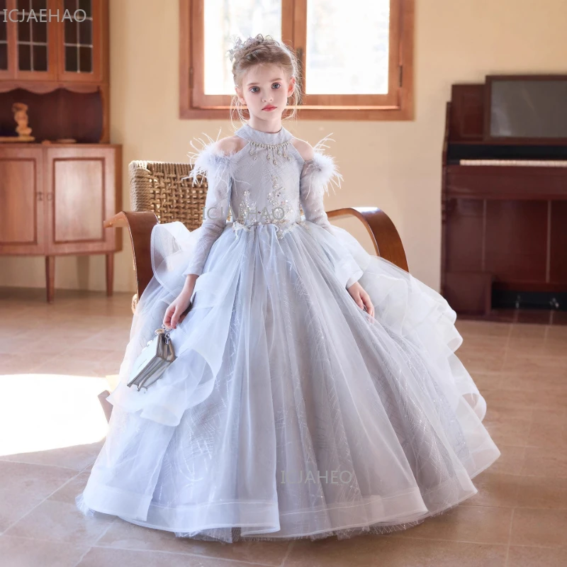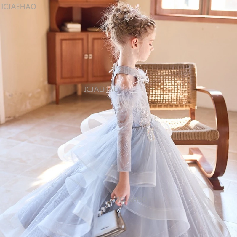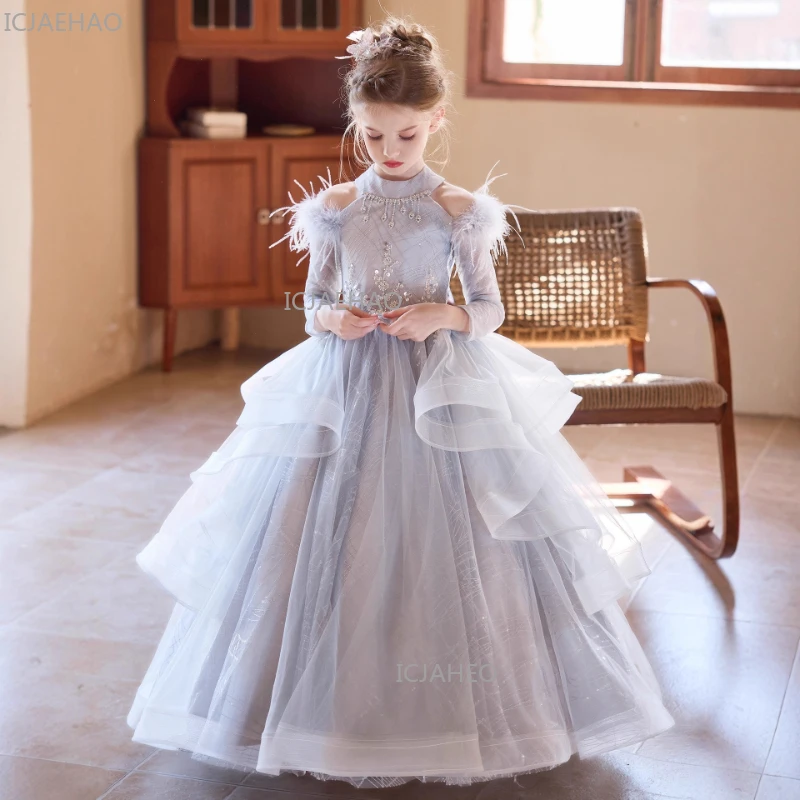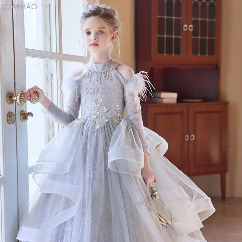 Szara Sukienka na Przyjęcie dla Dziewczynek z Długim Rękawem, Suknia na Konkurs Piękności, Ubranie dla Dzieci na Urodziny, Strój Księżniczki, Sukienka dla Druhny, Elegancka Odzież Wieczorowa, Strój na Występ, Ubranie Formalne