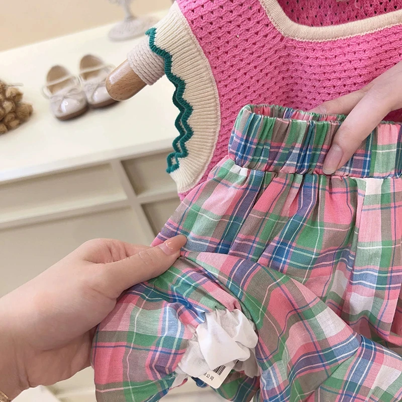 Zestawy ubrań dla dziewczynek 2025 letni koreański różowy cienki dzianinowy zestaw dla dziewczynek dzieci Hollow oddychająca kamizelka + spodenki z pąkami kwiatowymi dwuczęściowe