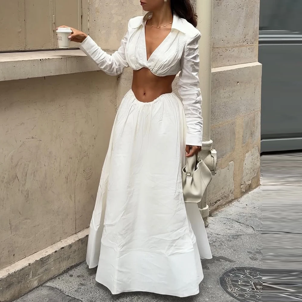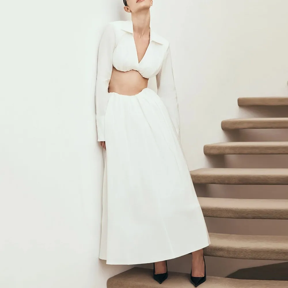 TWOTWINSTYLE Biały Zestaw Dwuczęściowy z Przecięciami i Marszczeniami, Damska Koszula z Długim Rękawem i Dekoltem w Serek, Minimalistyczny Streetwear, Zestaw Spódnicy Damskiej, Moda