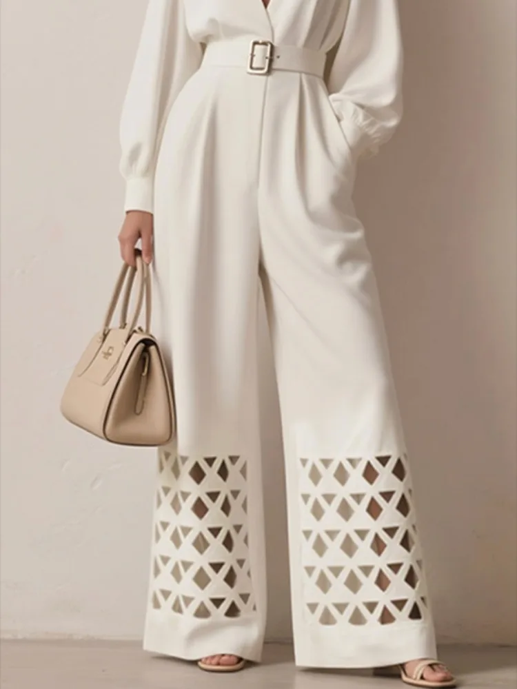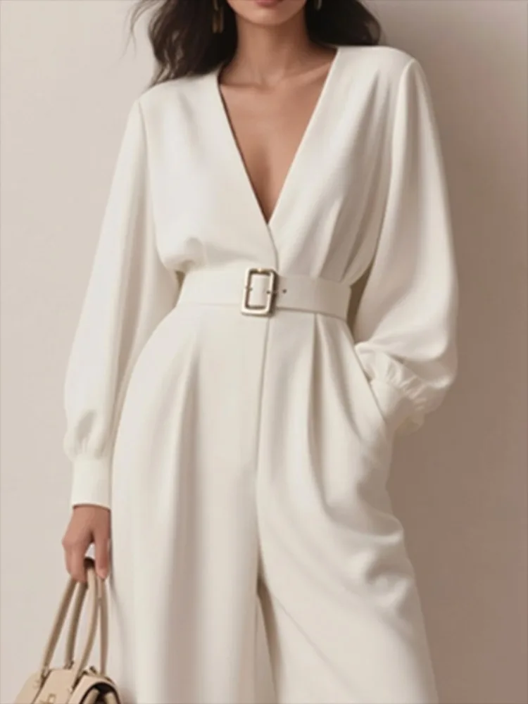 Kombinezony damskie Yeezzi z wydrążonej skóry PU, z paskiem, głęboki dekolt w serek, długie rękawy, jednolity kolor, miejskie kombinezony biznesowe dla kobiet.