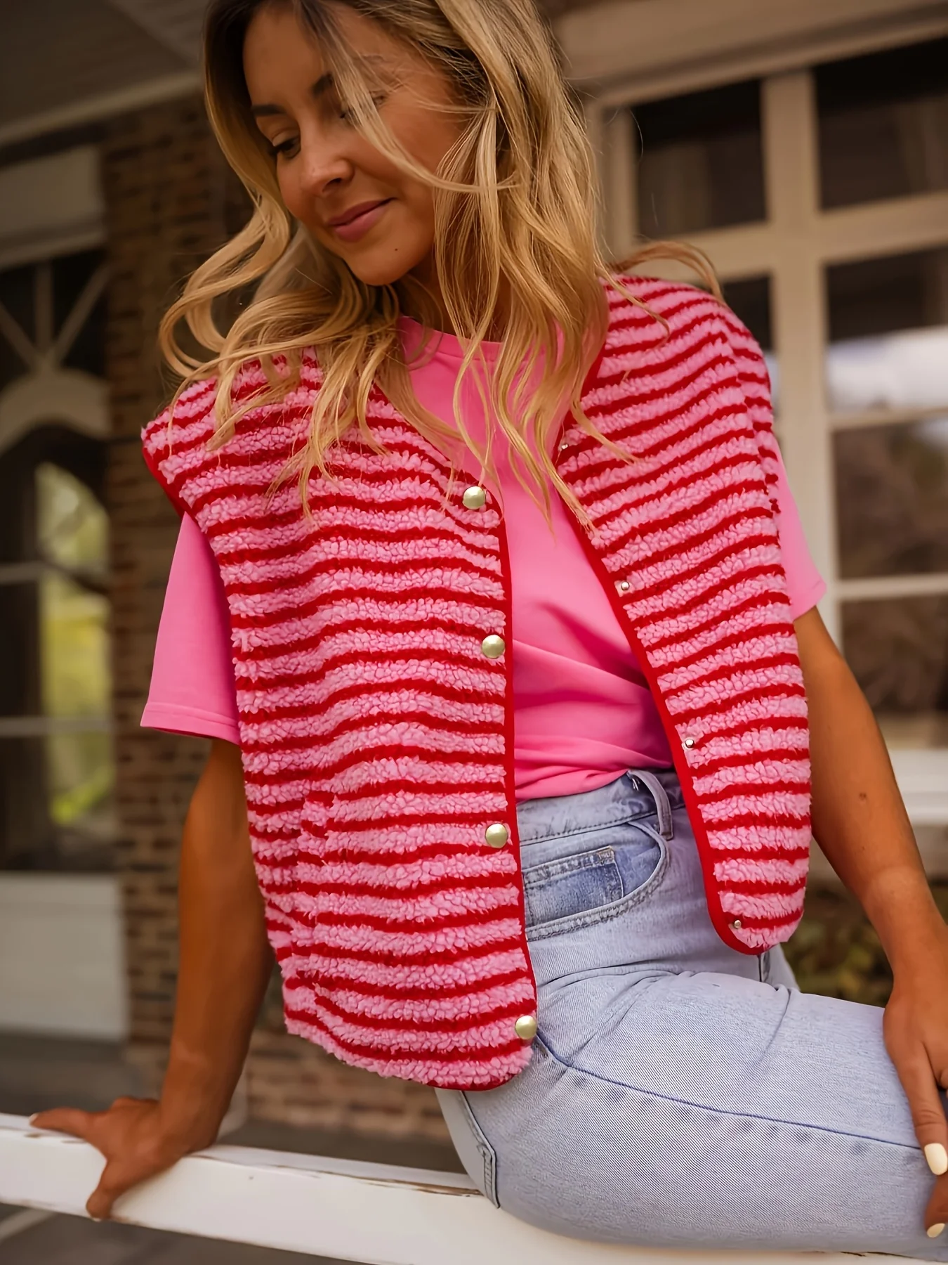 Damska czerwono-różowa, paski, puszysta kamizelka, luźna, zapinana na guziki, bez rękawów, odkryte plecy.