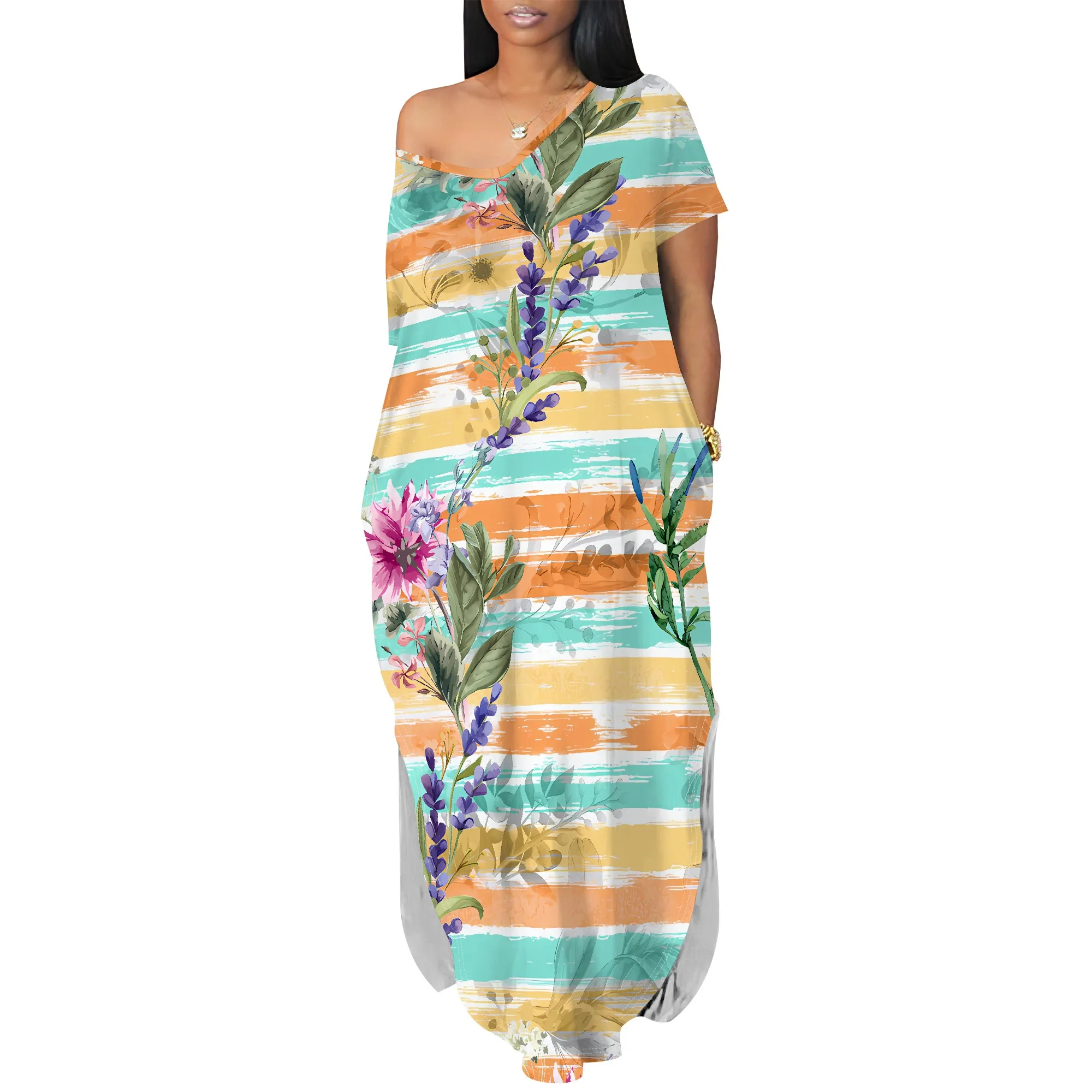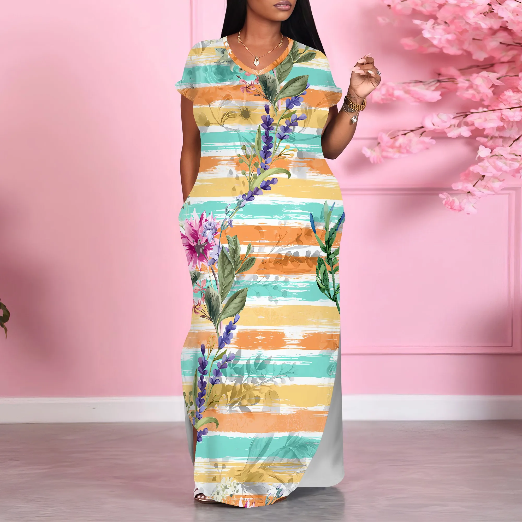 Damska letnia modna, drukowana sukienka z krótkim rękawem i dekoltem w szpic dla kobiet Luźna sukienka z dwoma rozcięciami z boku Casual Maxi Dress With Pocket