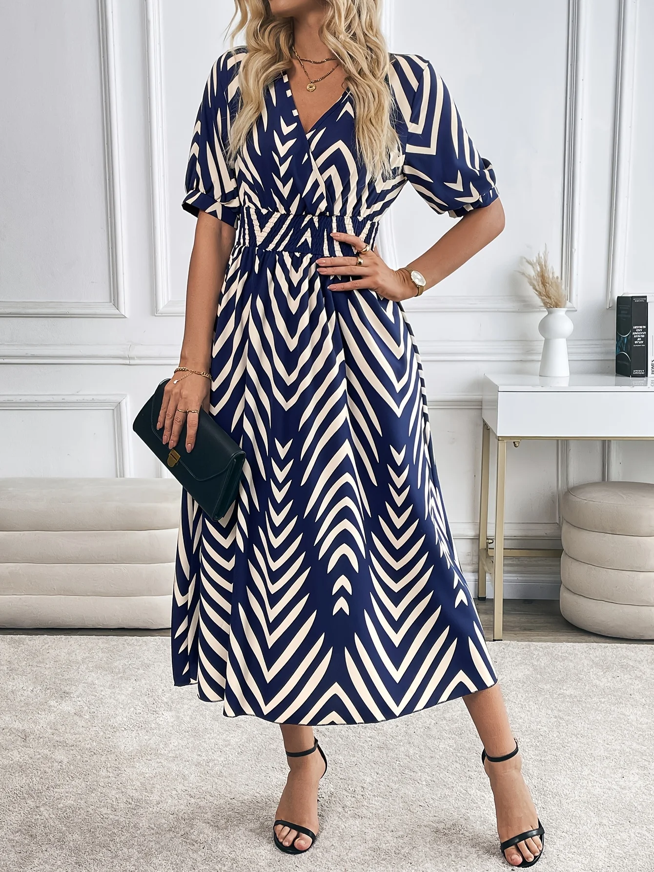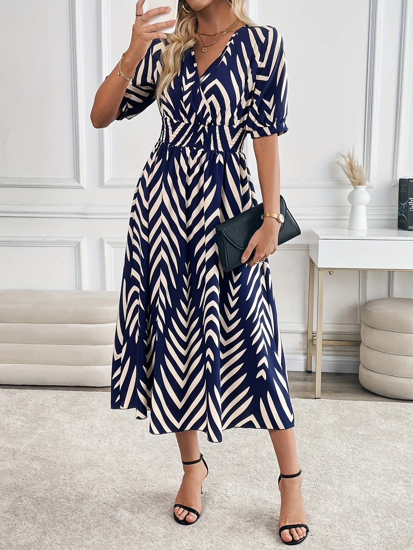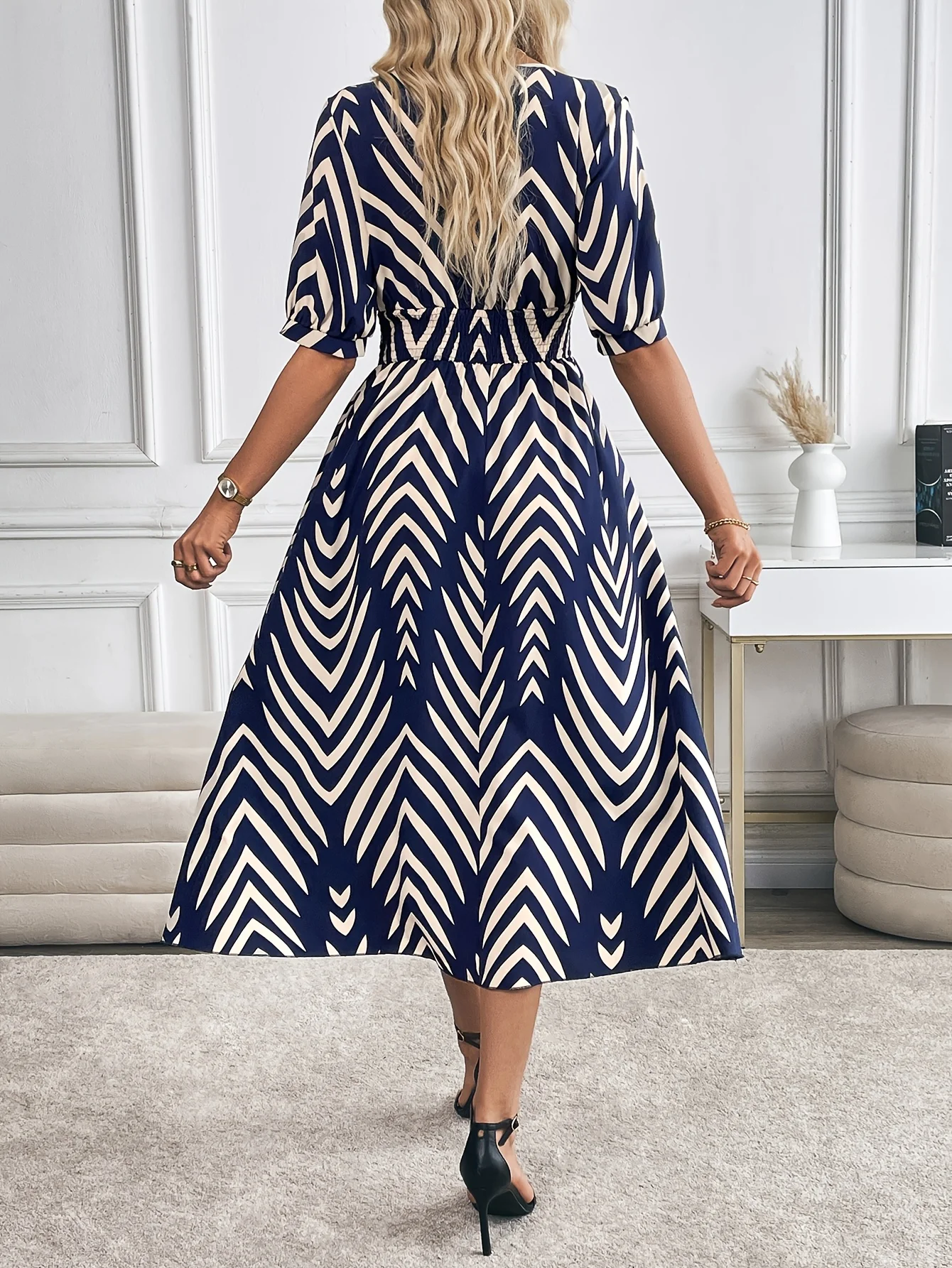 Elegancka sukienka z geometrycznym wzorem, rozkloszowana, damska, modna, codzienna spódnica