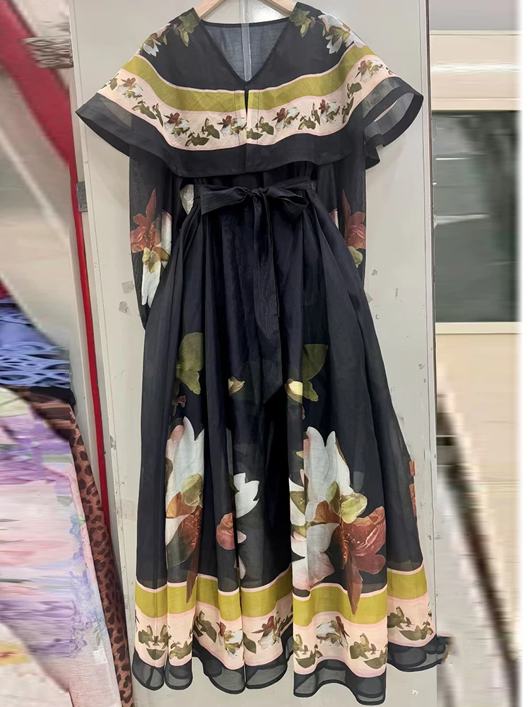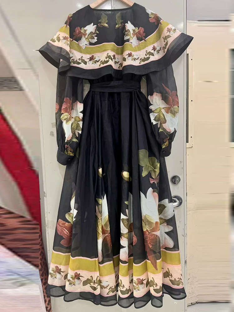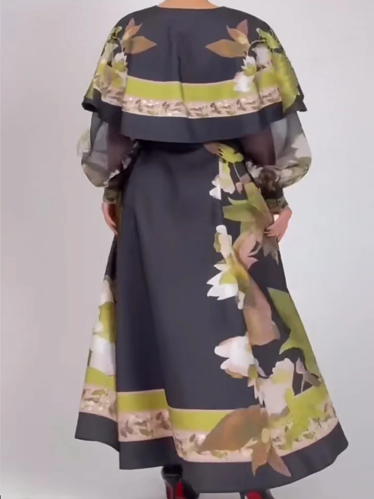 Sukienka damska retro 2025, nowa kolekcja jesień, dekolt w serek, płaszczowy krój, długi rękaw typu lampion, luźna, z nadrukiem, wiązana w talii, z dużym, puszystym dołem.