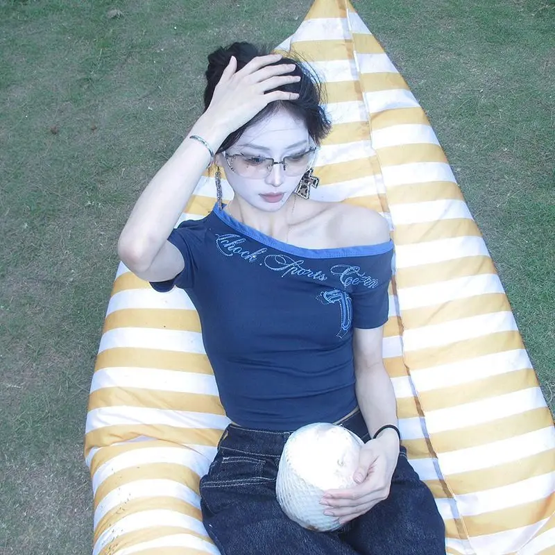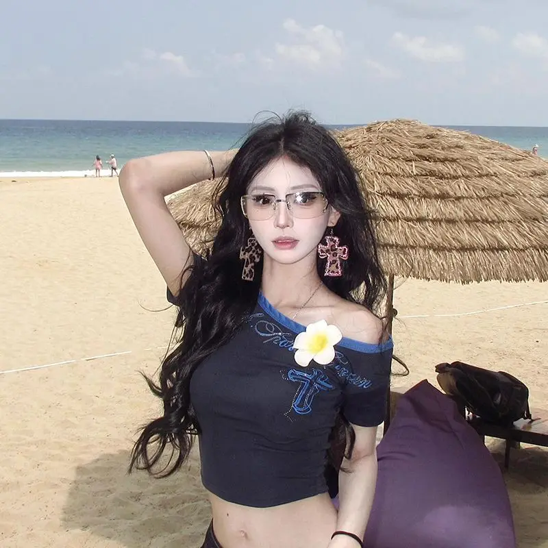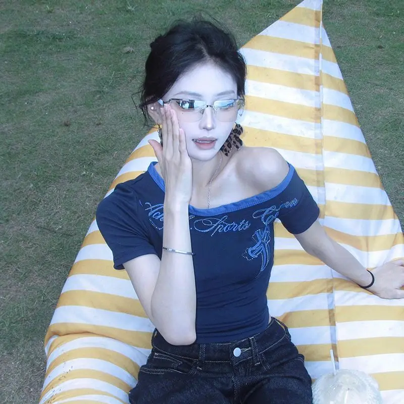 Damska koszulka z krótkim rękawem w stylu retro, letnia, mała, dopasowana.