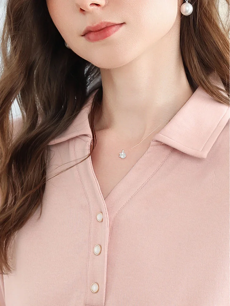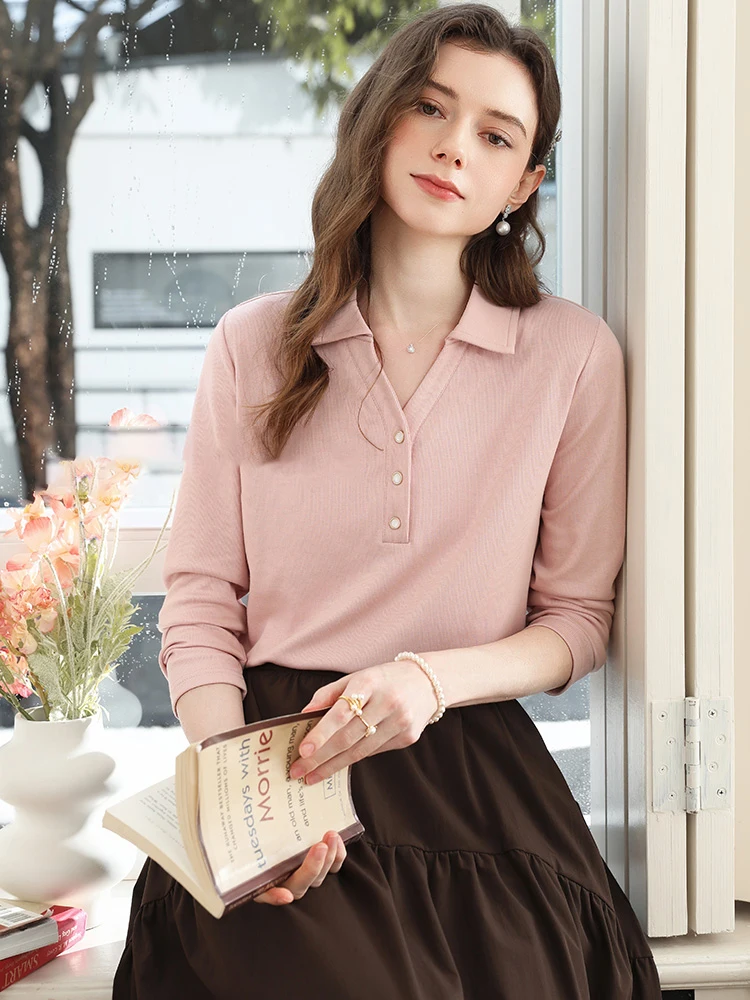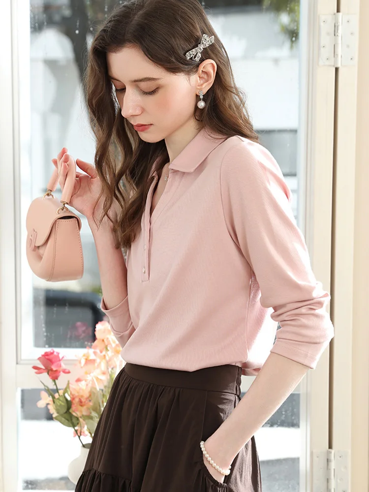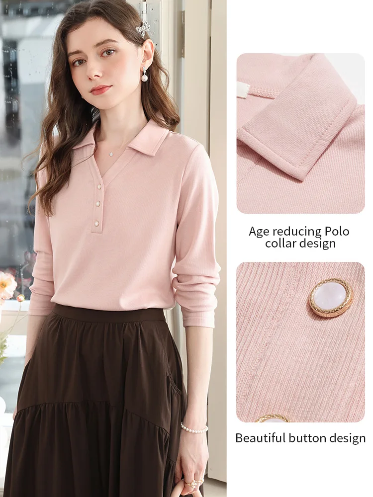 Koszulka damska I BELIEVE YOU z lyocellu, różowa, na jesień 2025, z kołnierzykiem polo, dekoltem w serek, codzienna, słodka, z długim rękawem, model 2253016103