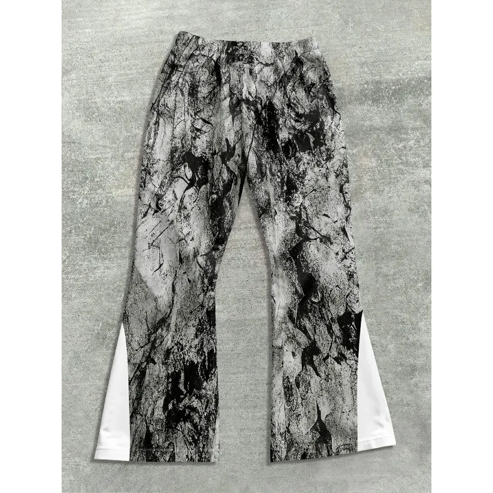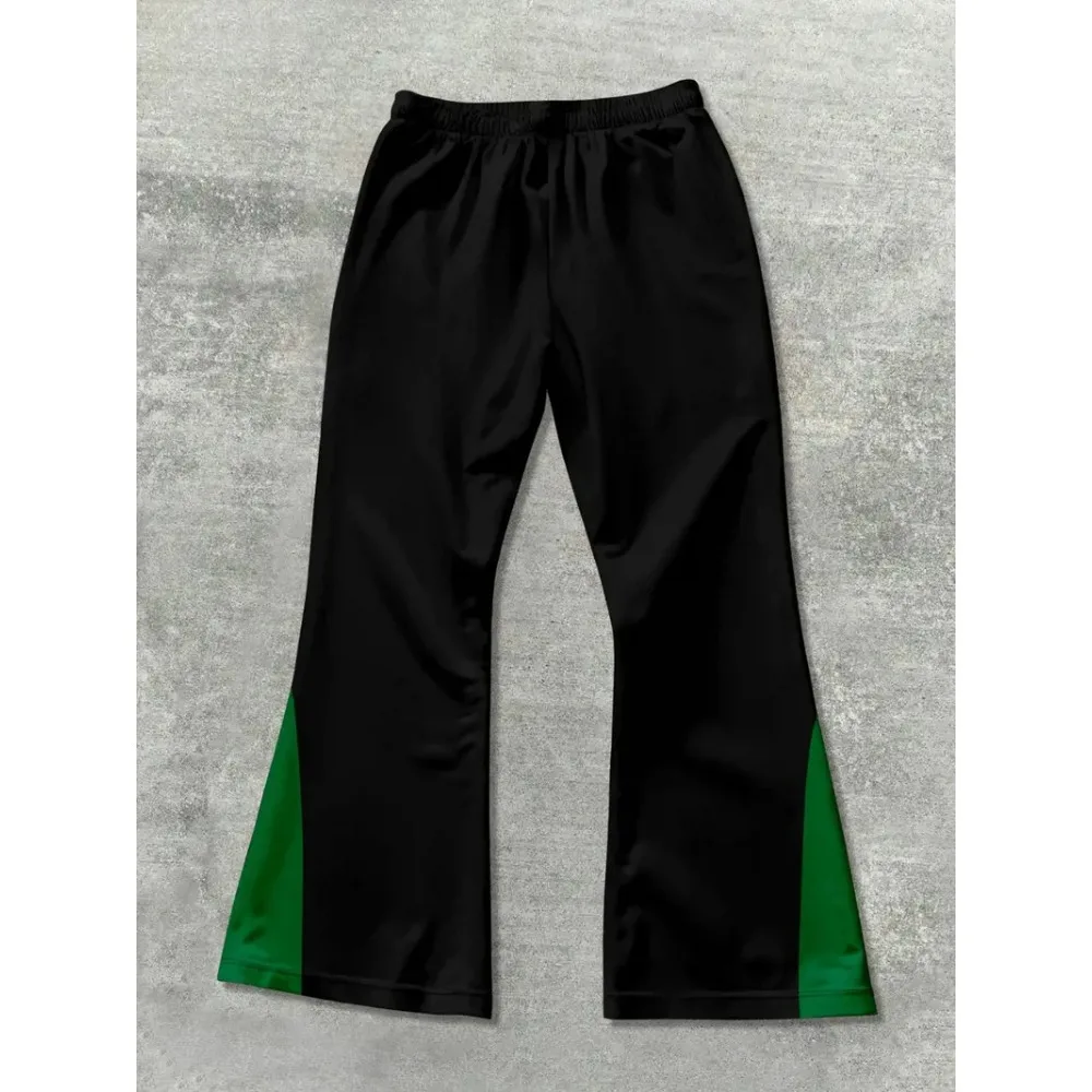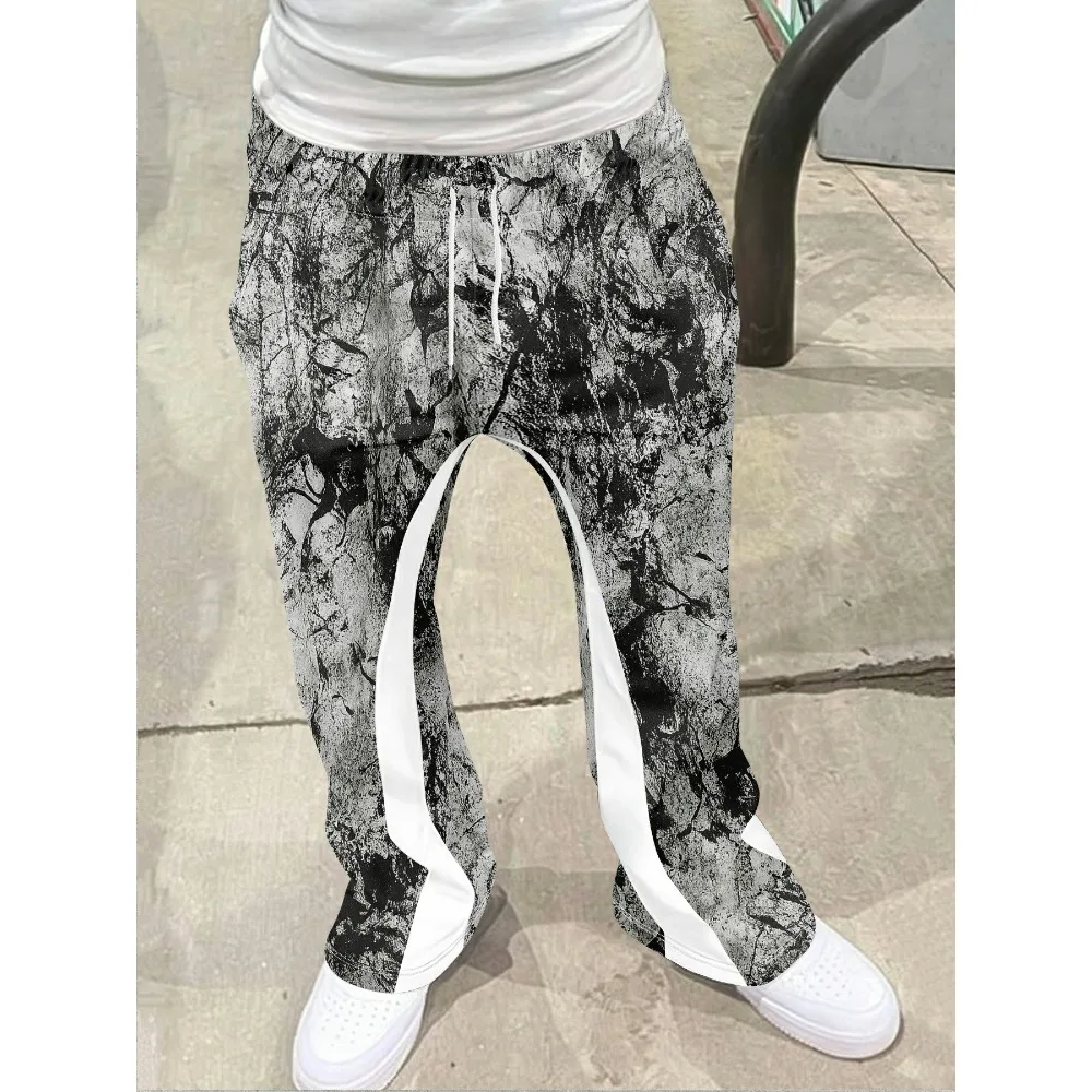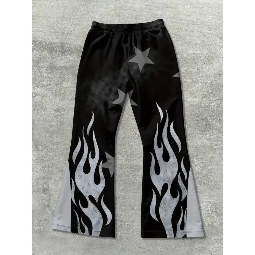 Męskie modne spodnie dresowe w stylu hip-hop z wyrazistymi elementami płomieni, z napisem "RICH SOON", przyciągające wzrok, idealne do streetwearu.