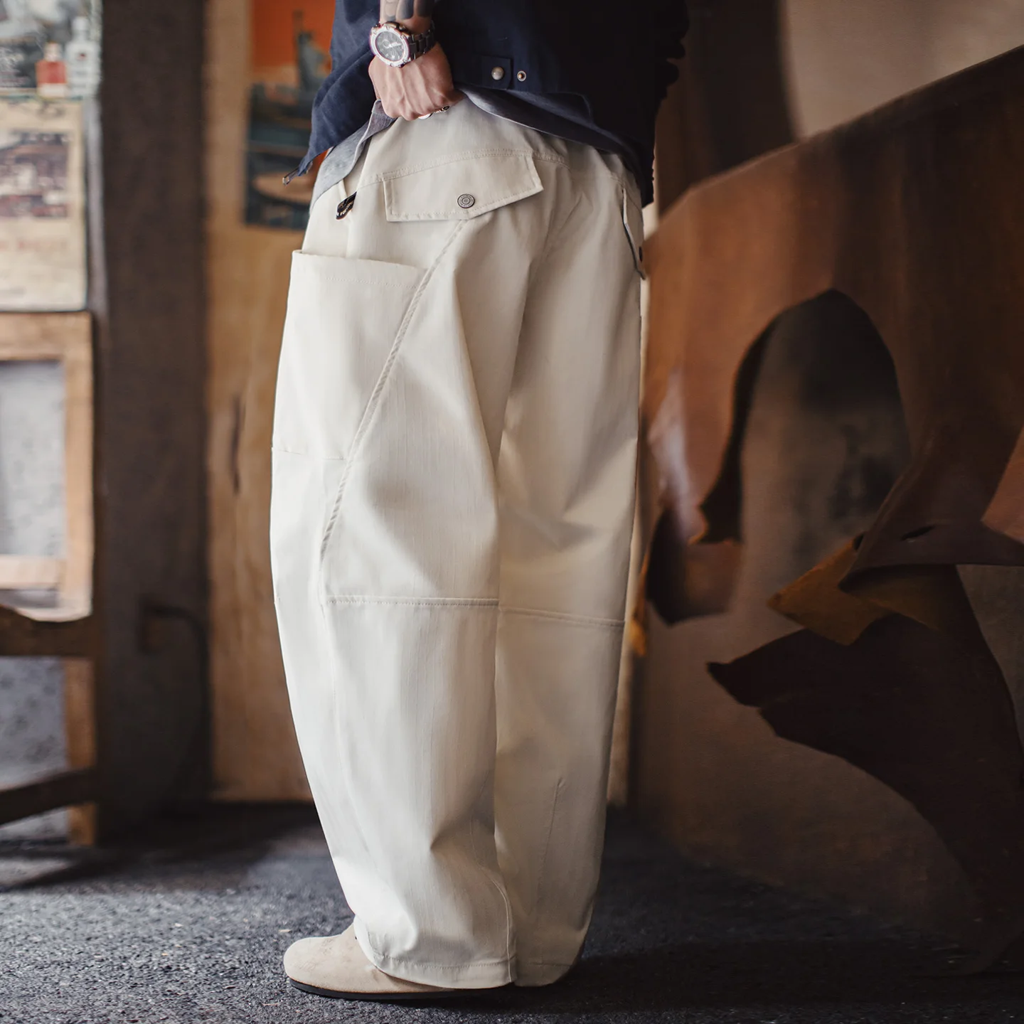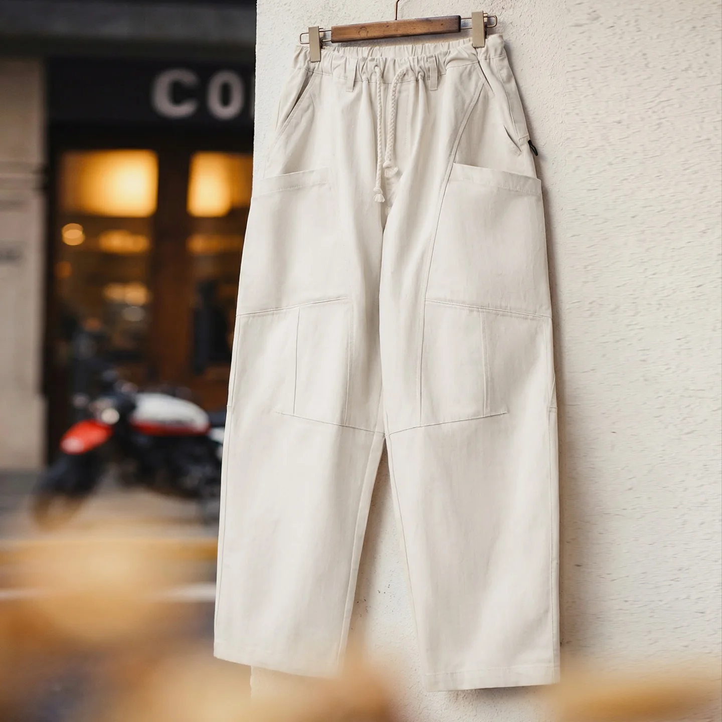 Maden Męskie Beżowe Spodnie ze Sznurkiem i Elastyczną Gumką w Pasie, Szerokie Nogawki, Luźny Krój, Patchworkowe, Casualowe Spodnie Cargo na Wiosnę i Jesień