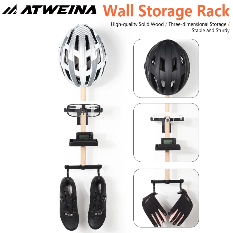 ATWEINA Stojak na rowery z litego drewna do montażu na ścianie, na kask, okulary, licznik rowerowy, bez wiercenia, do zawieszania i ekspozycji
