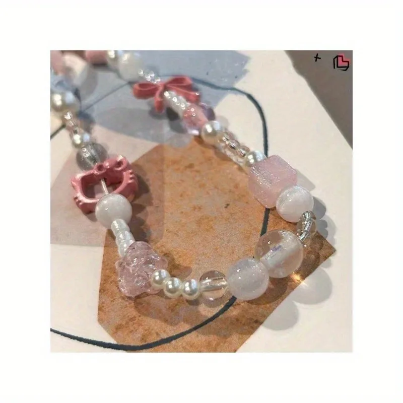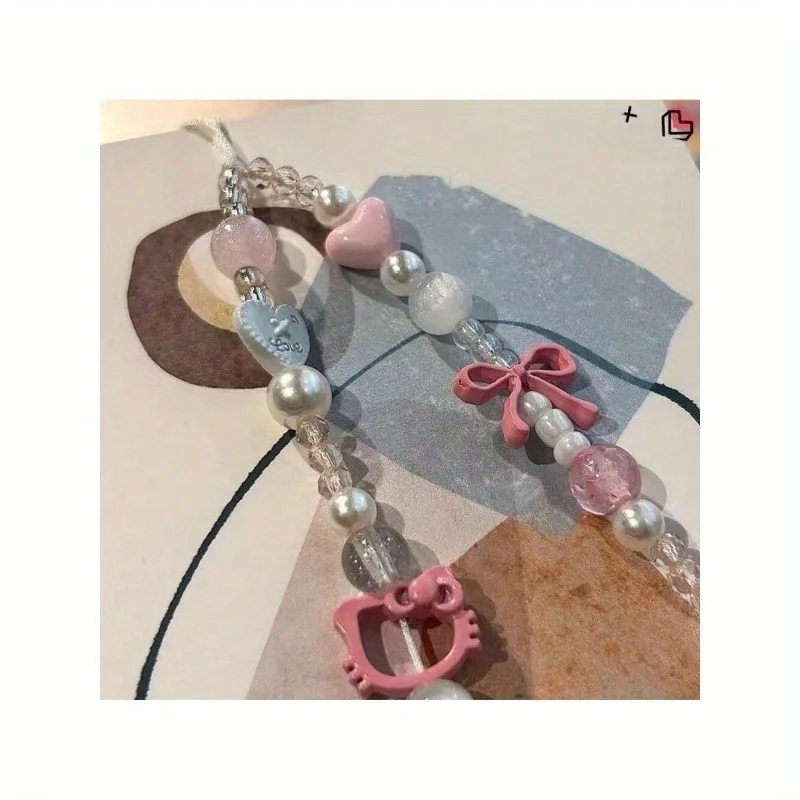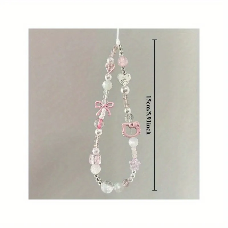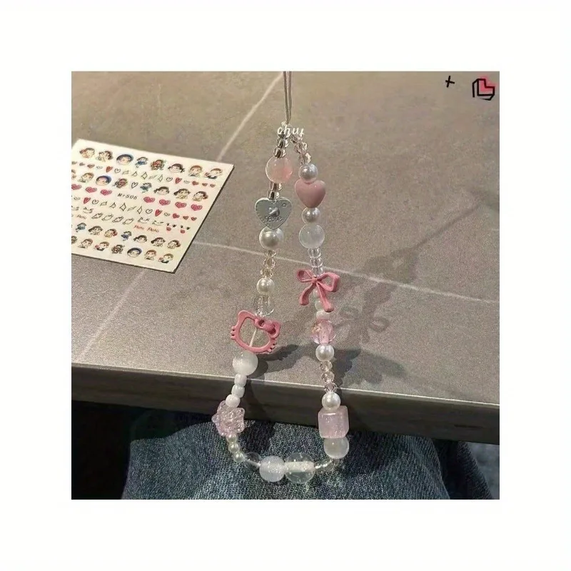 Uroczy łańcuszek do telefonu Sanrio Hello Kitty, różowy, koralikowy, breloczek, biżuteria, zawieszka do aparatu, kreskówkowy pasek do telefonu z kotkiem, prezent