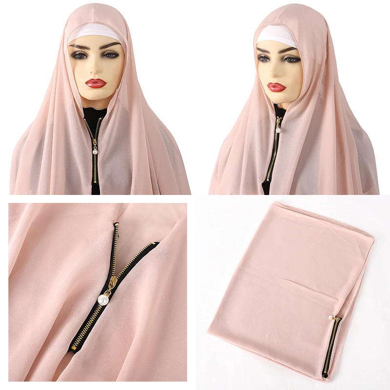 2025 lenço hijab muçulmano com zíper bolha lisa chiffon pronto para usar véu hijab envoltório xales sólidos lenço turbante ramadan