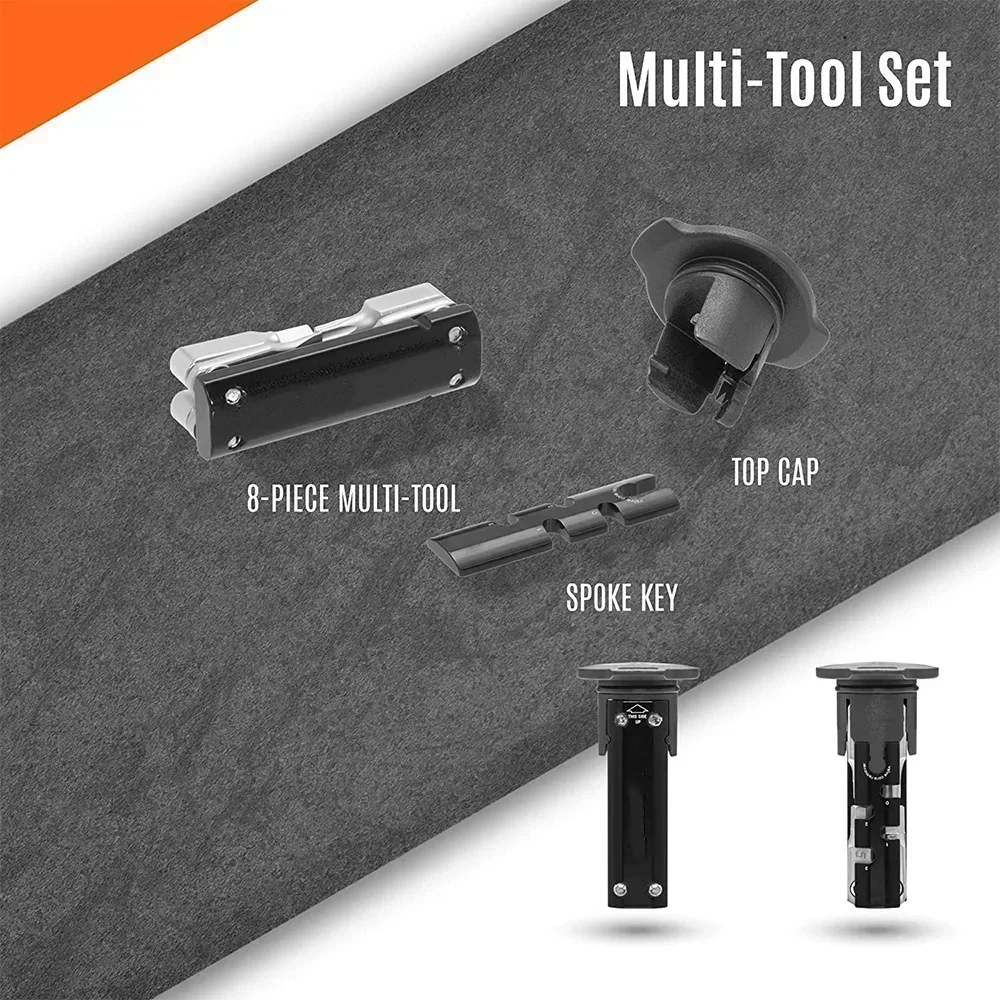 8-piece Multi-tool: 2, 2.5, 3, 4, 5, 6, T25, Flathead / Spoke key: 0, 1, 2, 3 with valve core removing function.