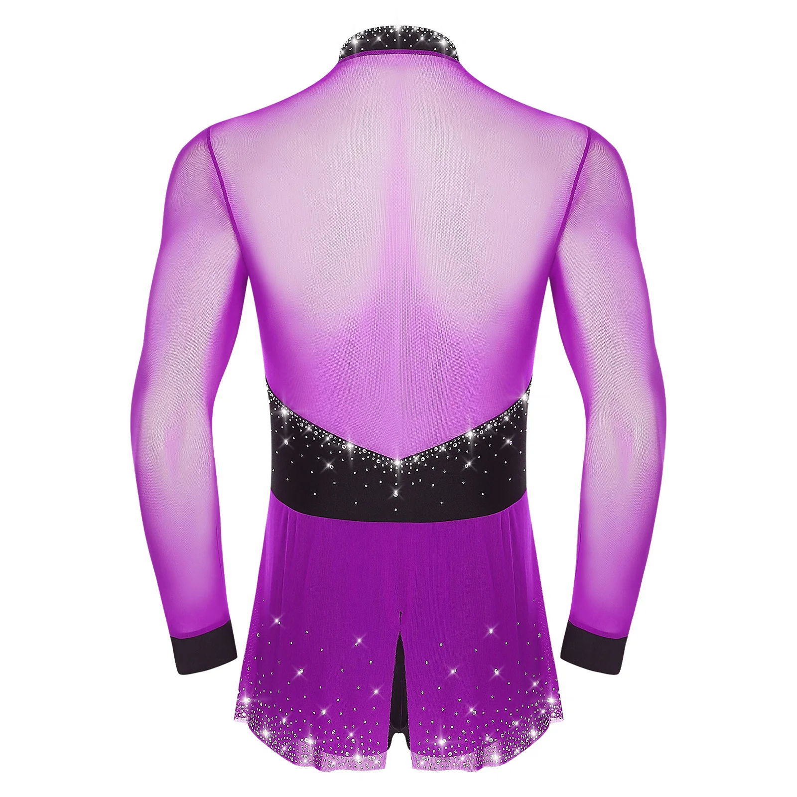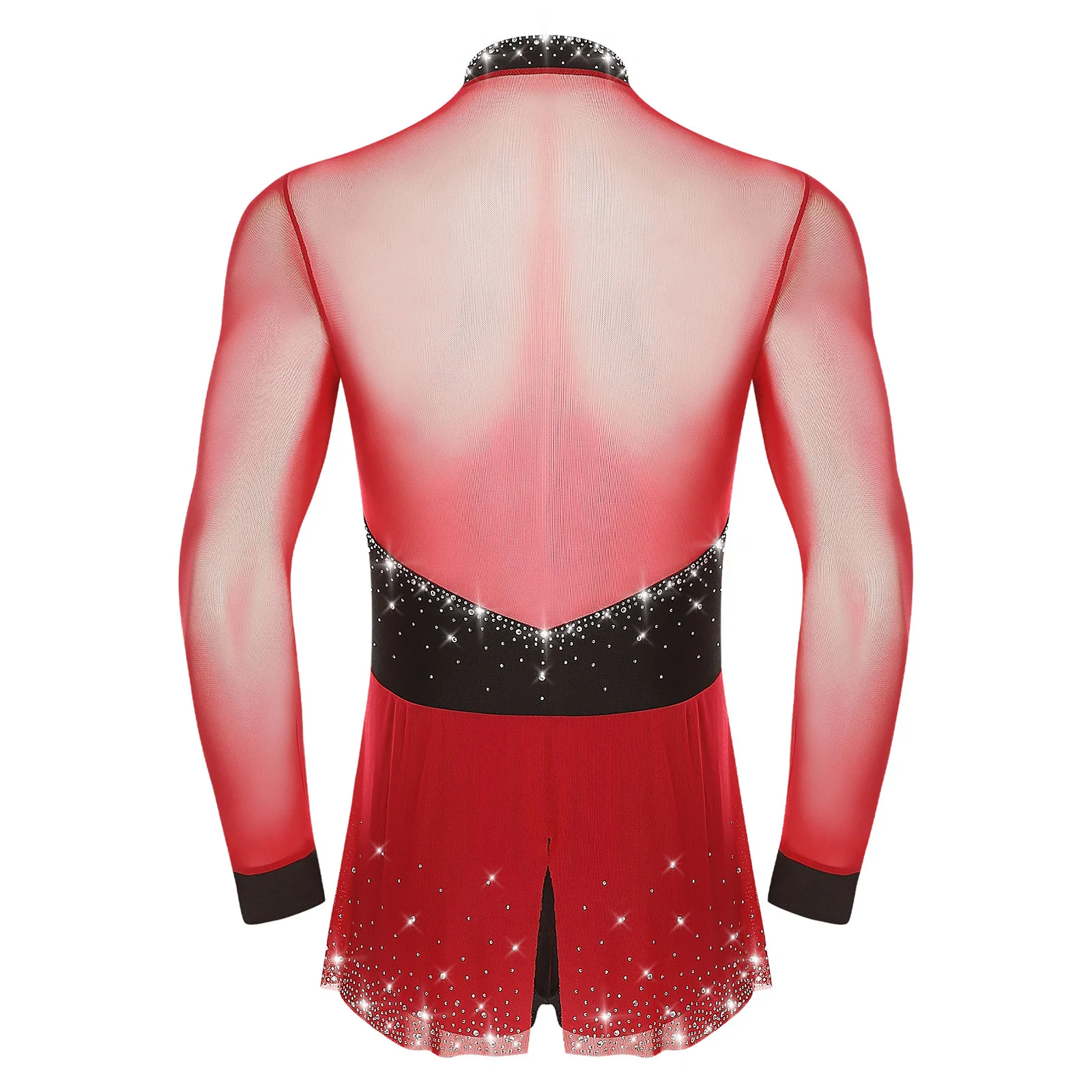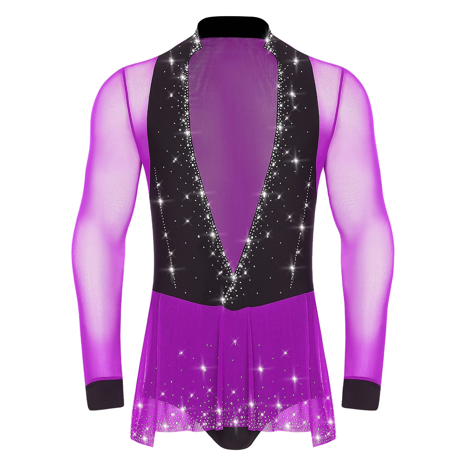 Strass dos homens ginástica latina salão de baile patinação artística traje sheer manga longa dimonds profundo decote em v collant bodysuit camisas