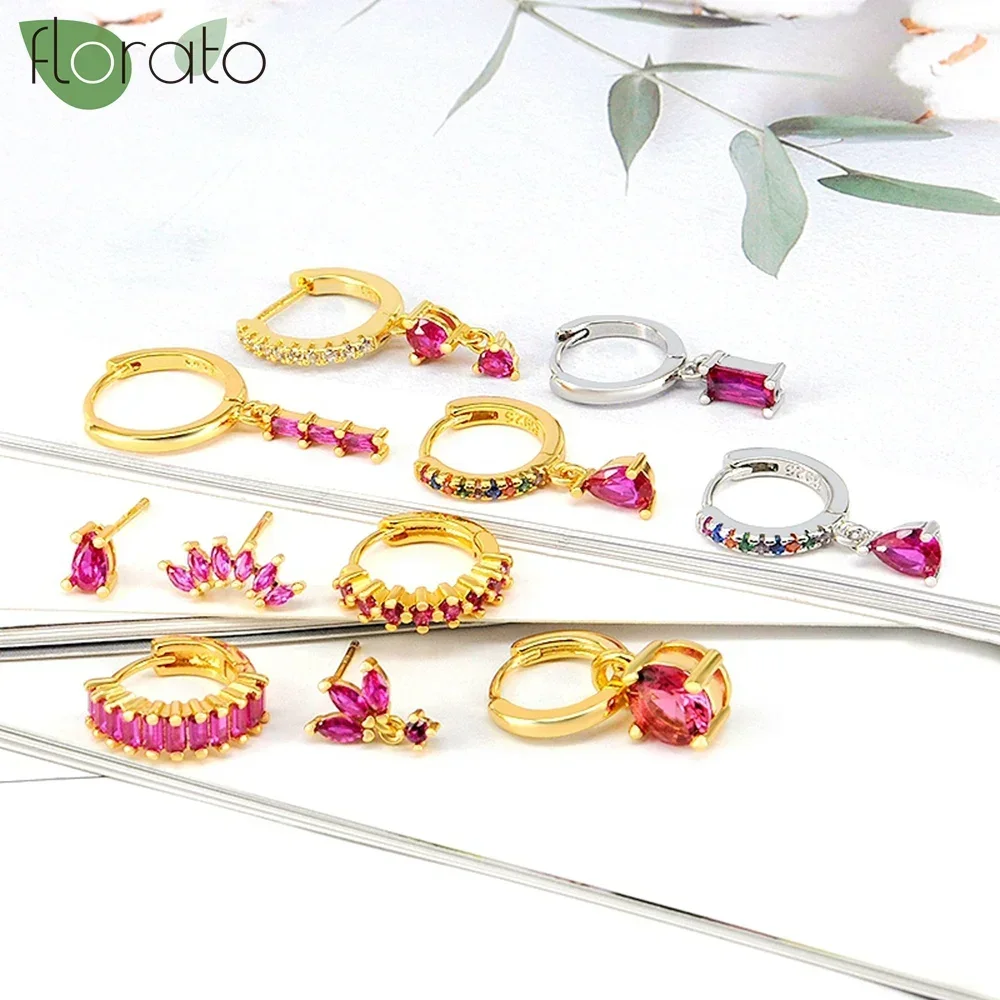 925 Sterling Silver Needle Rose Red Crystal Heart Pendant Earrings Fashion 18k Gold Hoop Earrings for Women Luxury Jewelry Gift
