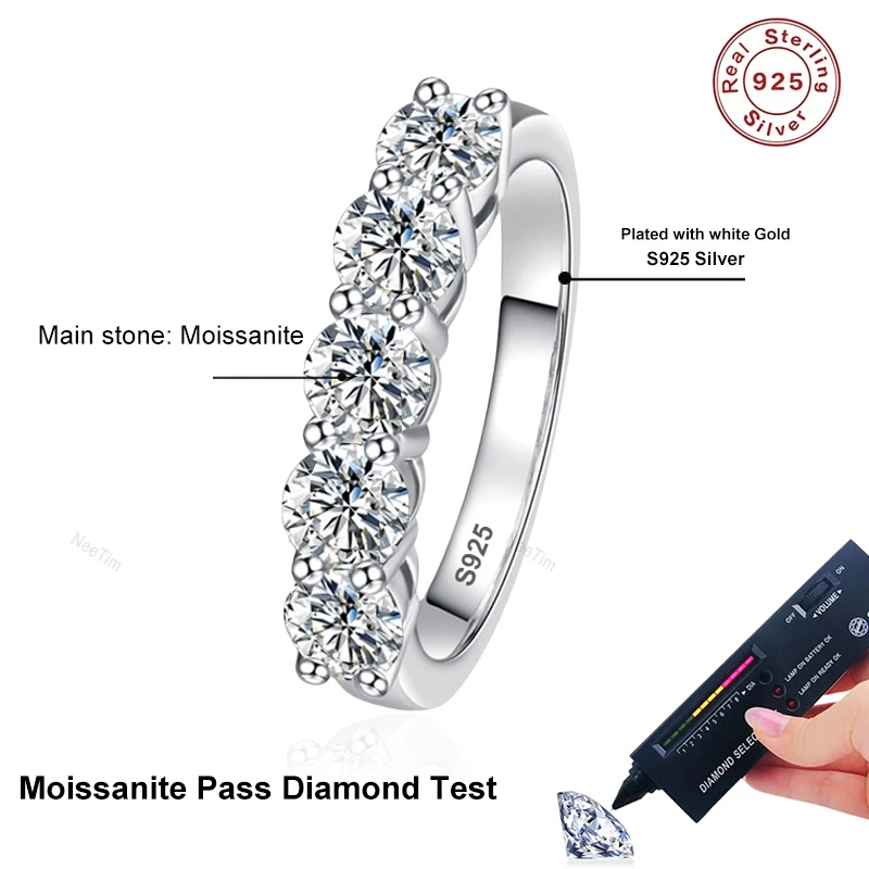 Anel de moissanite completo de 4mm NeeTim para mulheres, 5 pedras, diamante, aliança de casamento, noiva, prata esterlina S925 com anéis banhados a ouro branco