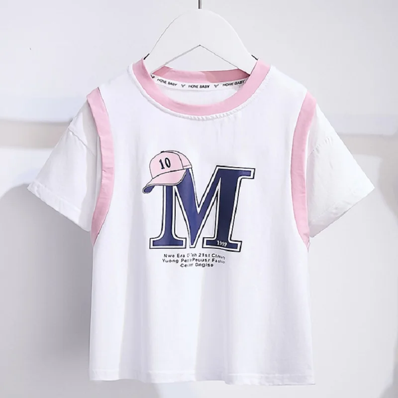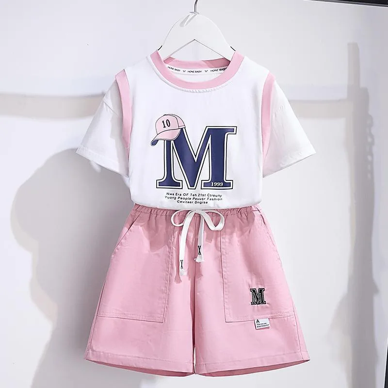 Conjunto infantil de camiseta e shorts de manga curta, moda adolescente, roupas superior e inferior, roupas de verão para meninas, terno 2 peças