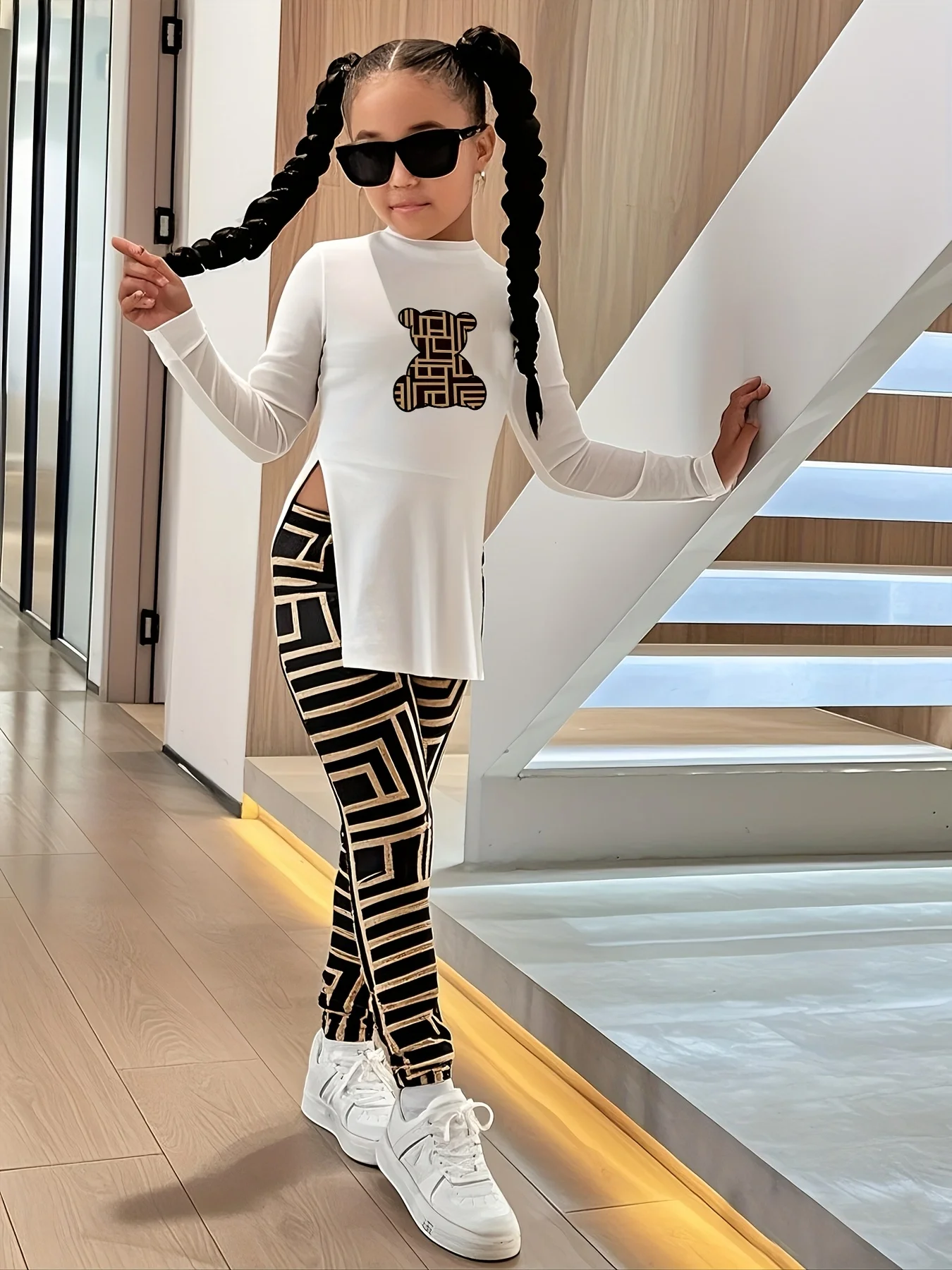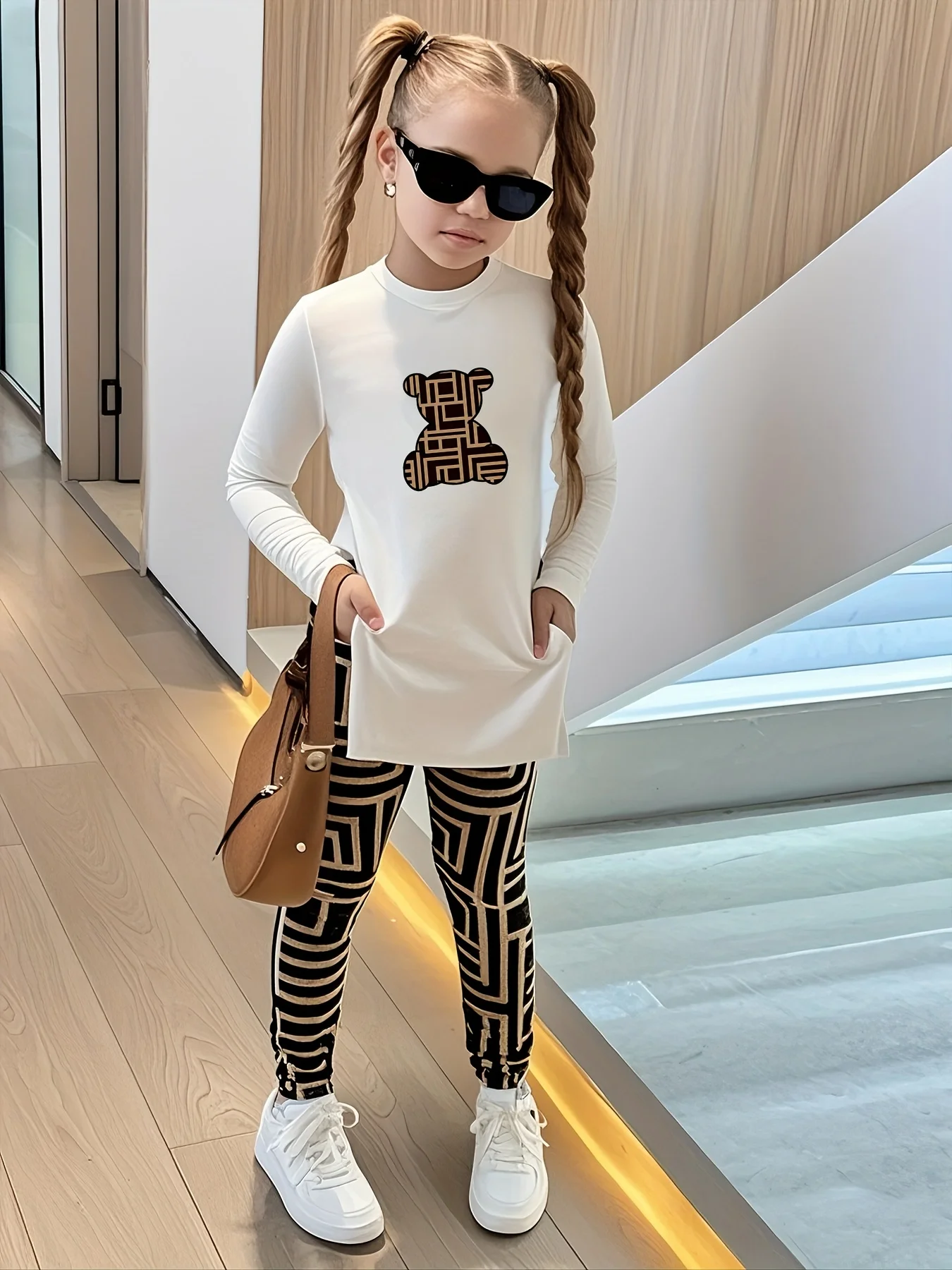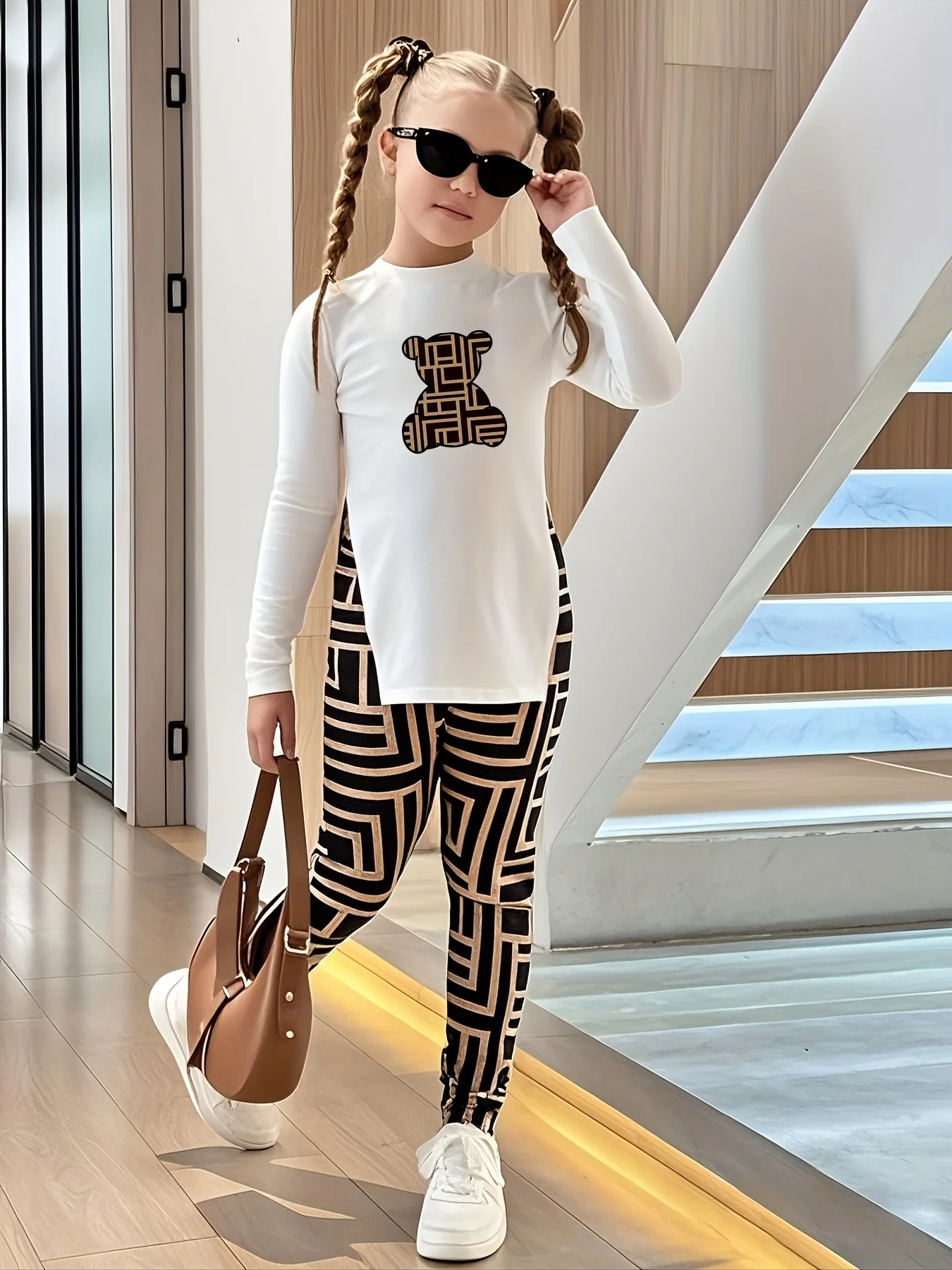 Crianças roupas menina esporte casual impressão de malha manga longa topo & padrão geométrico leggings conjunto menina para esporte ao ar livre casual de duas peças