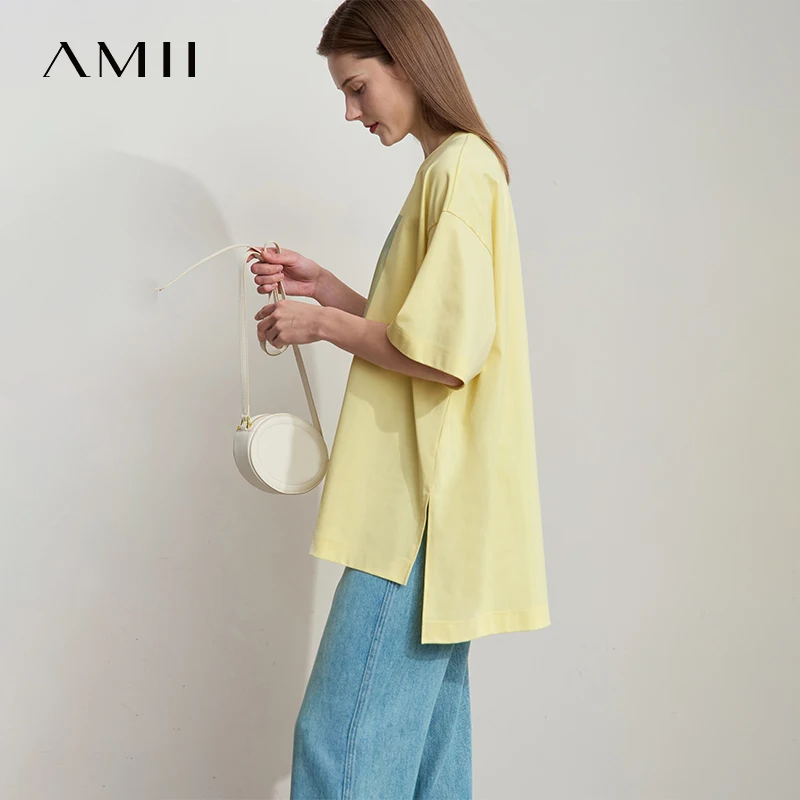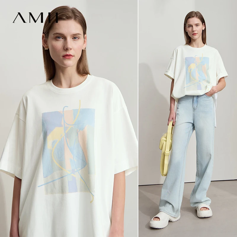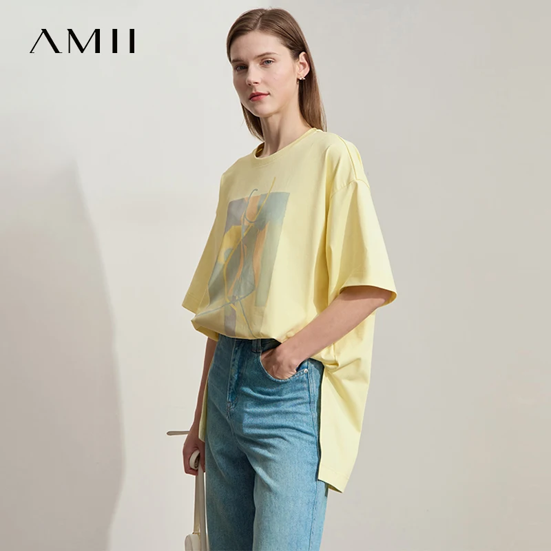 Amii minimalista verão camiseta feminina design irregular topos casual o pescoço impressão abstrata solta ombro caído camiseta 12522081