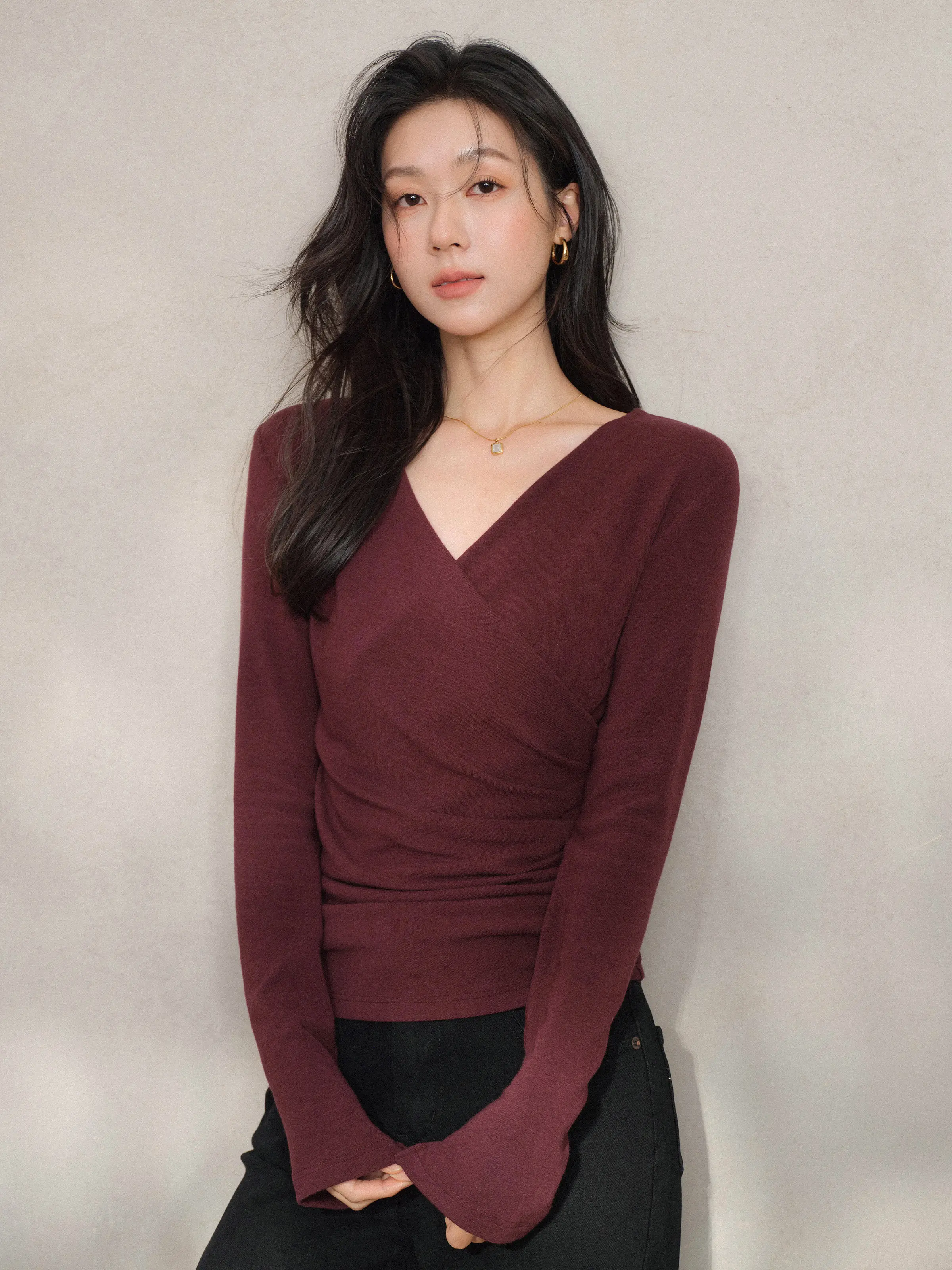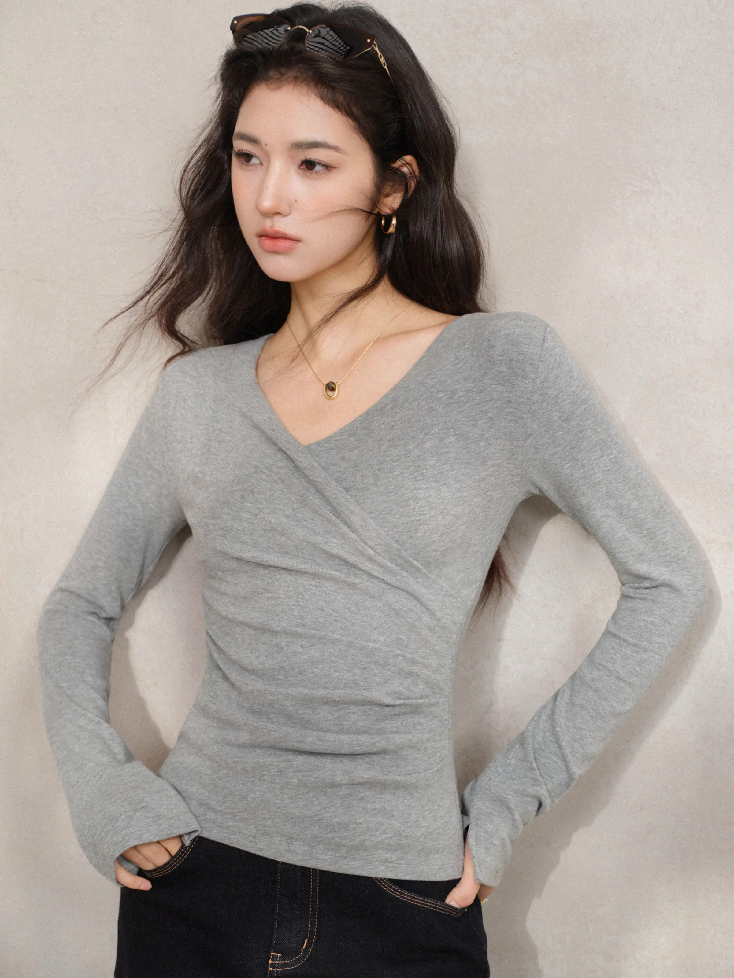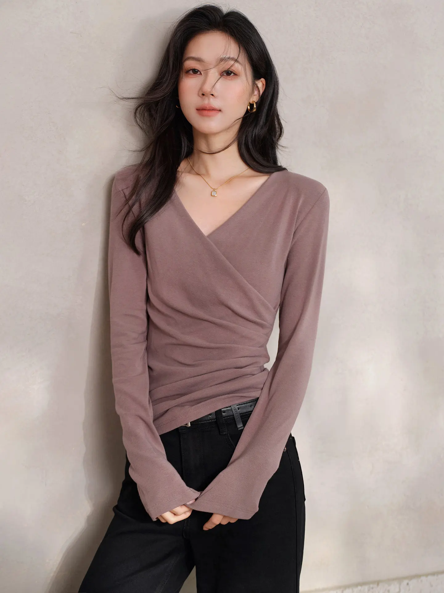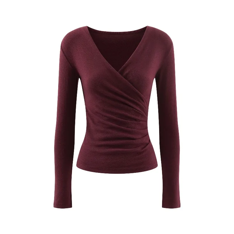 Blusa Elegante de Malha com Decote em V Cruzado e Franzido, Ajuste Slim, Manga Longa para Mulheres, Estilo Casual Chic para o Início da Primavera