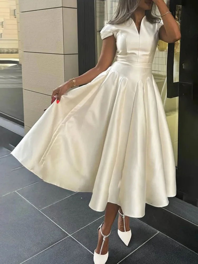 2025 vestido de noite elegante feminino cor sólida com decote em v mangas fino ajuste cintura alta a linha vestidos de festa plissados