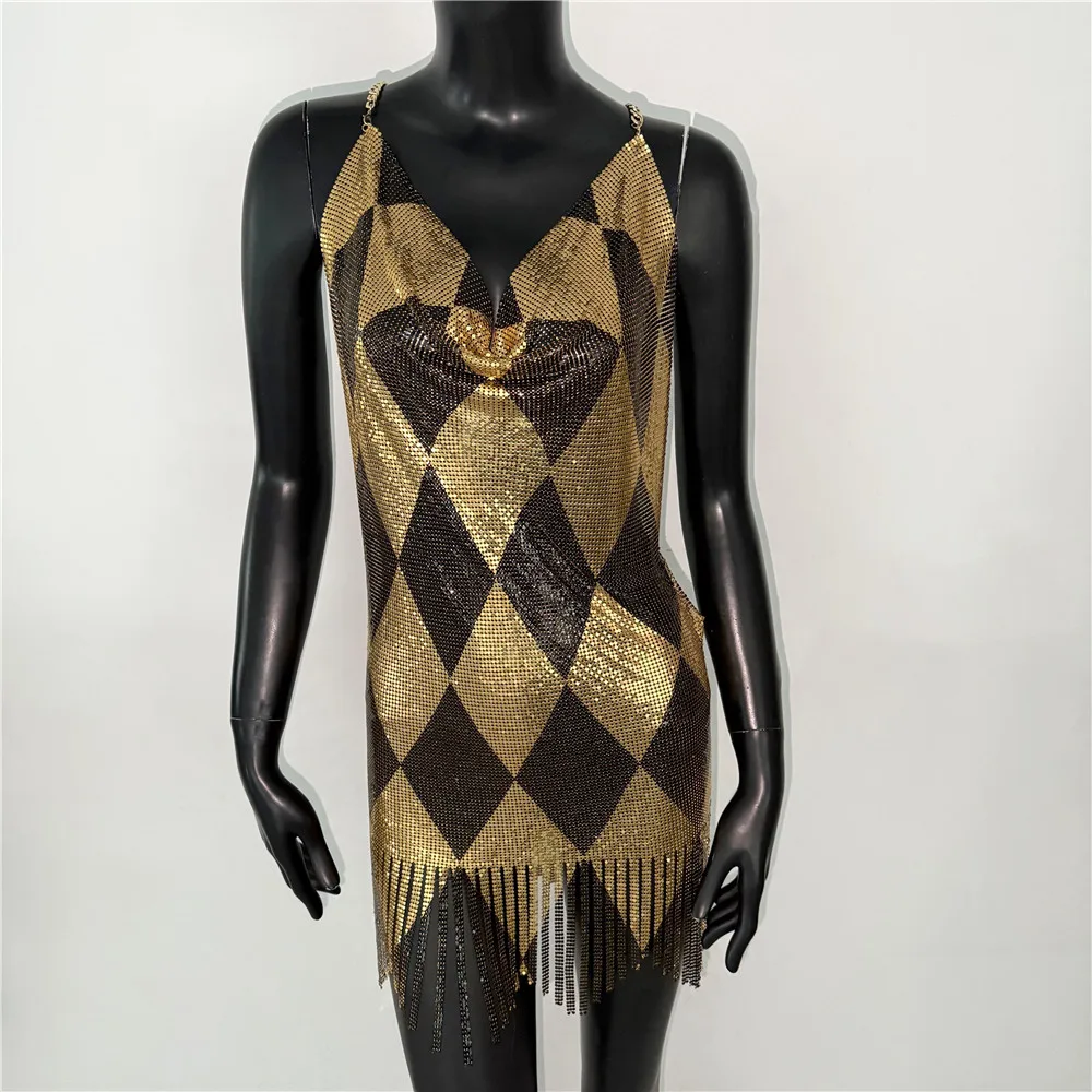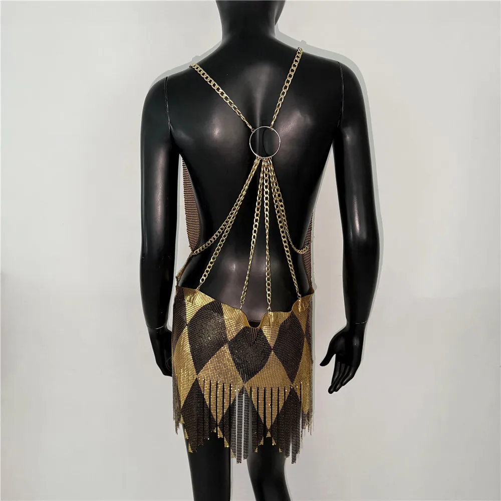 Halloween feminino metal lantejoulas vestido sexy sem costas borla decote em v sem mangas mini vestido rave festival festa vestidos de noite