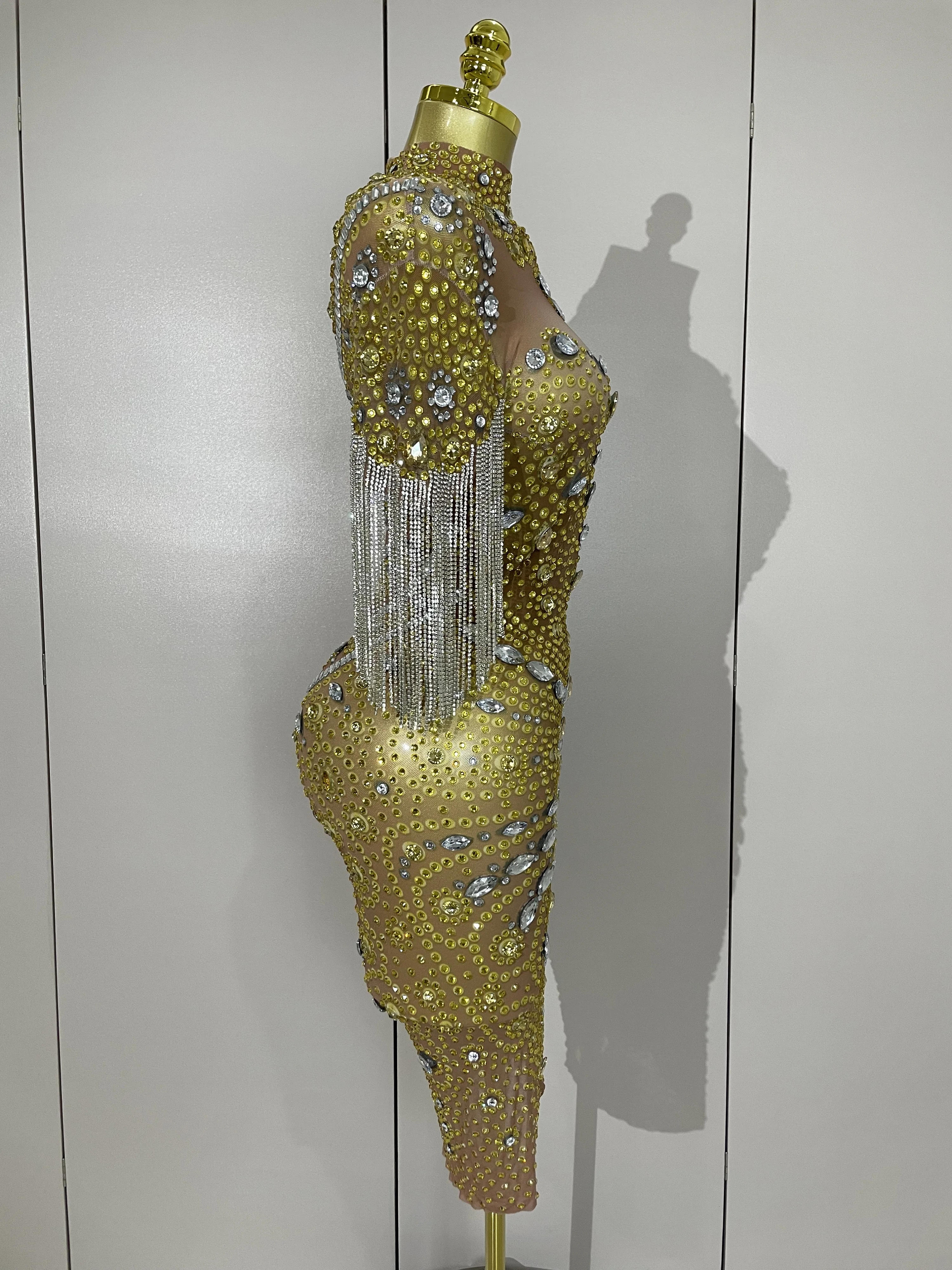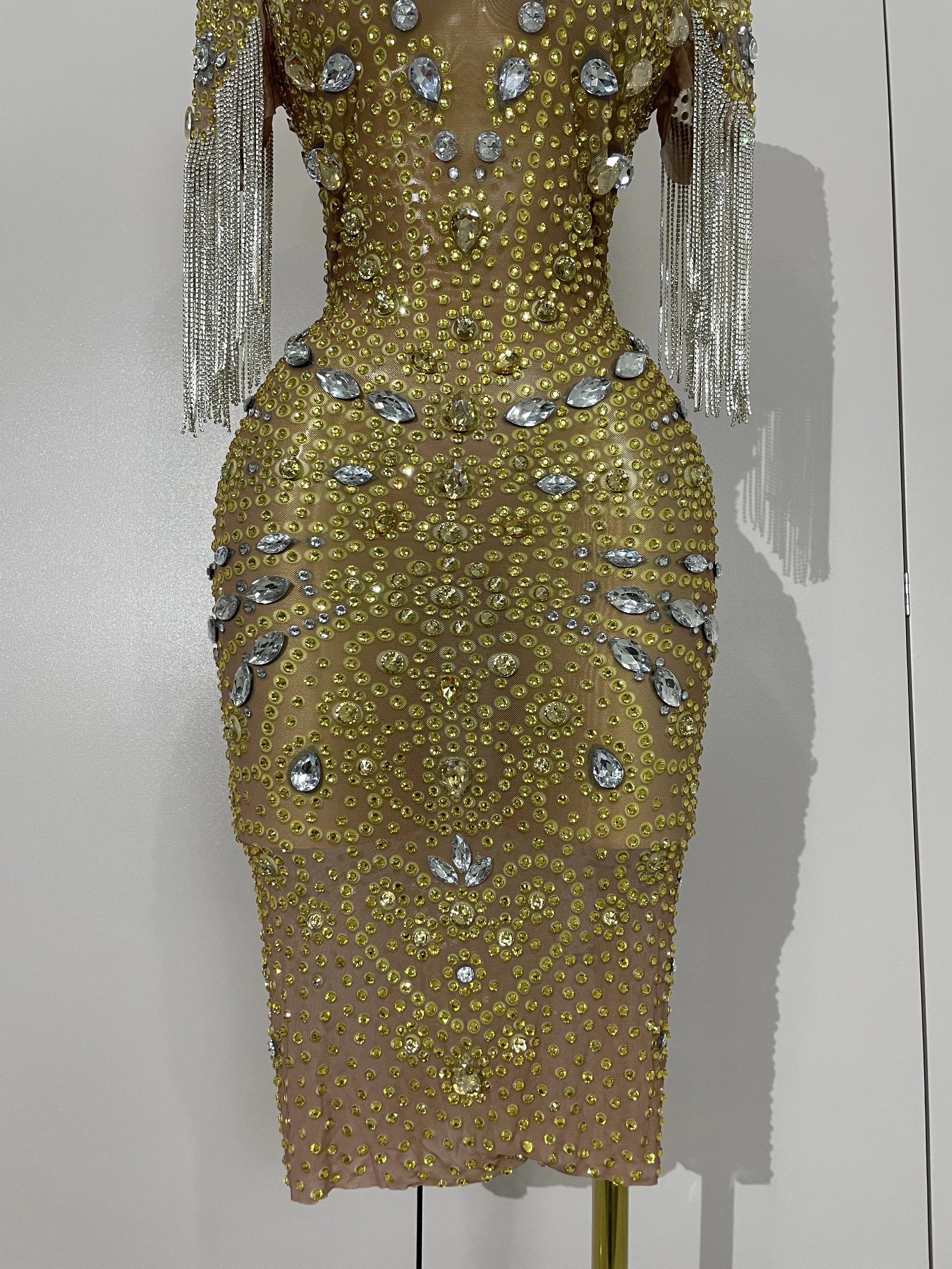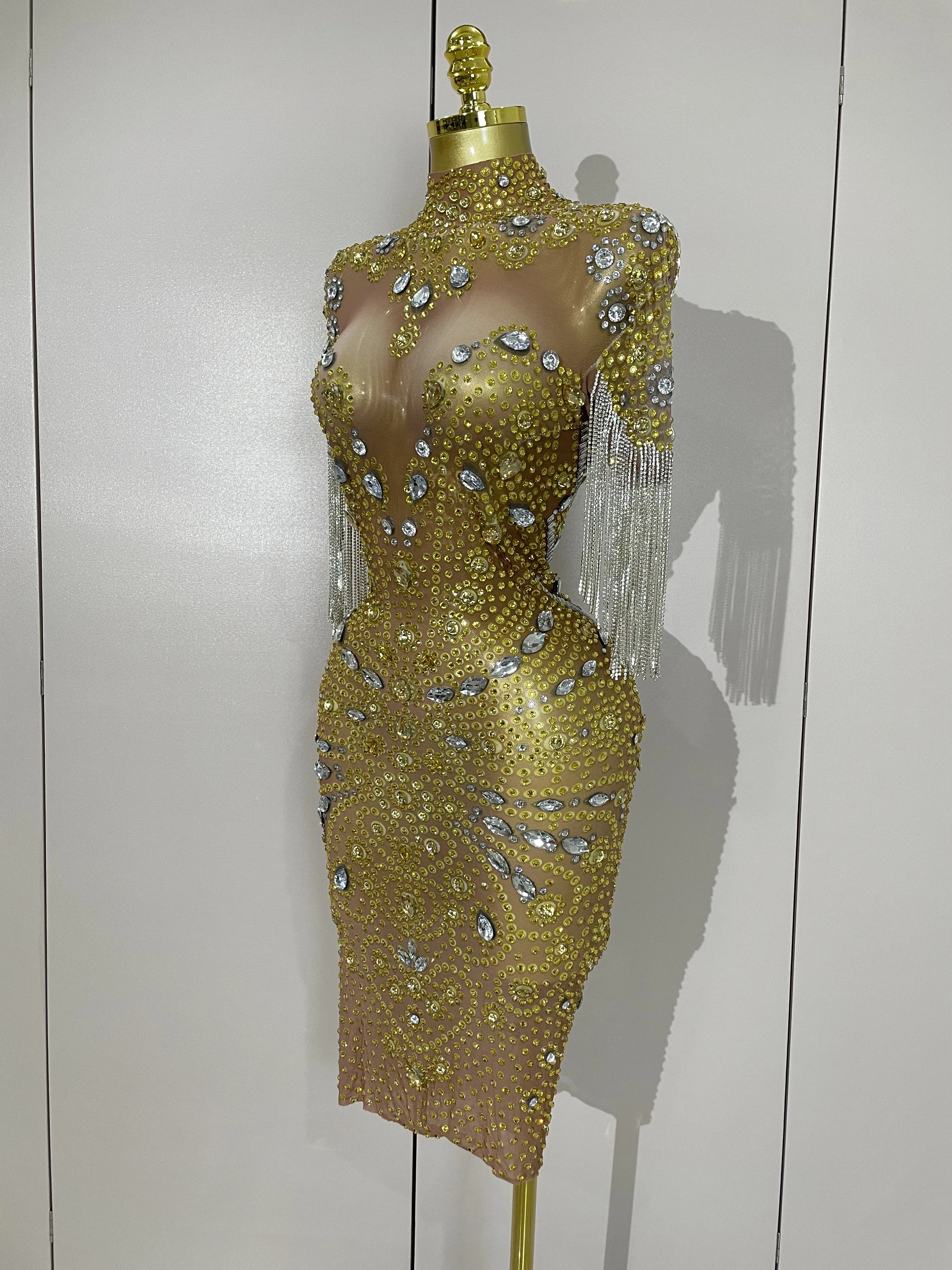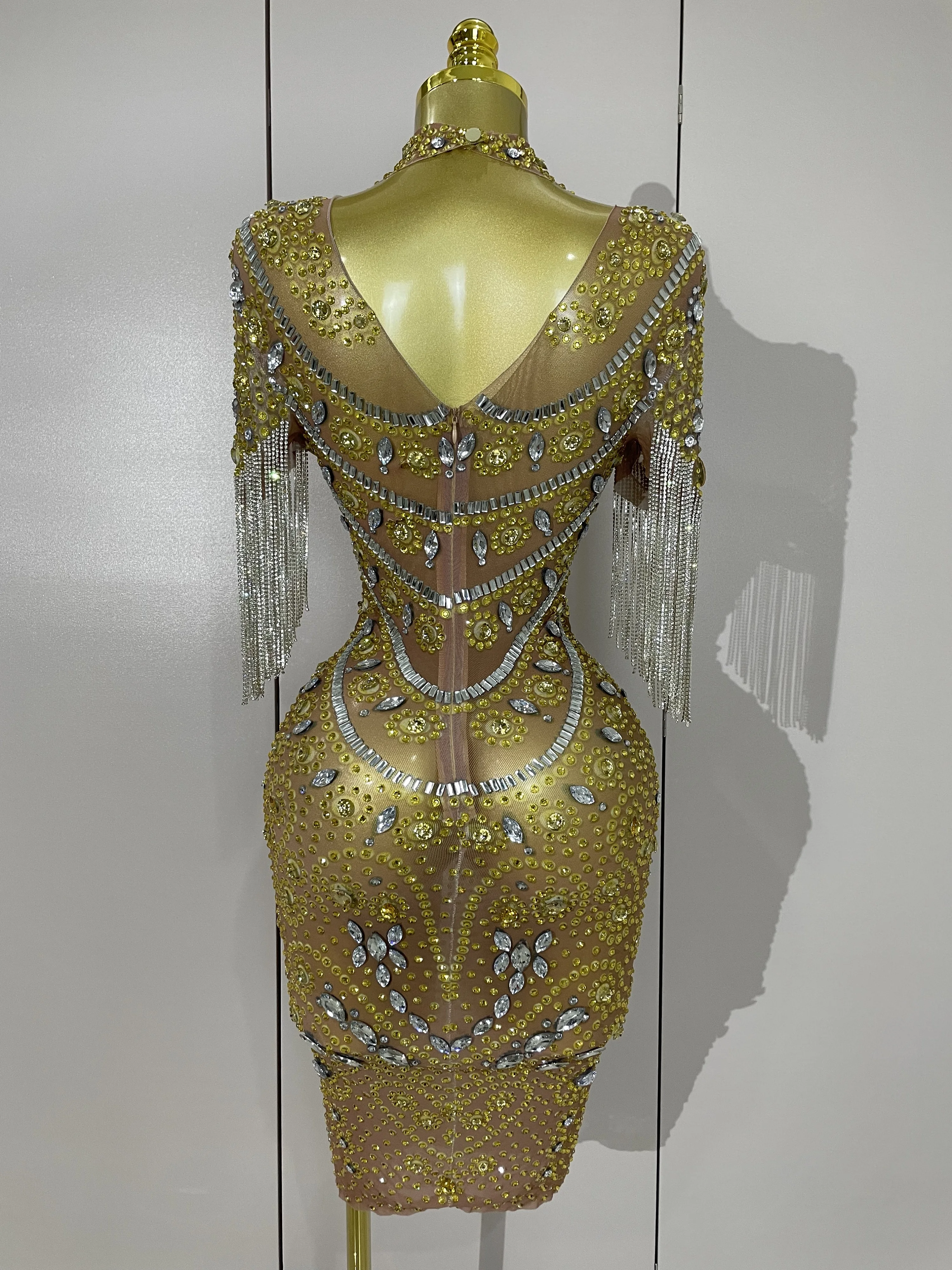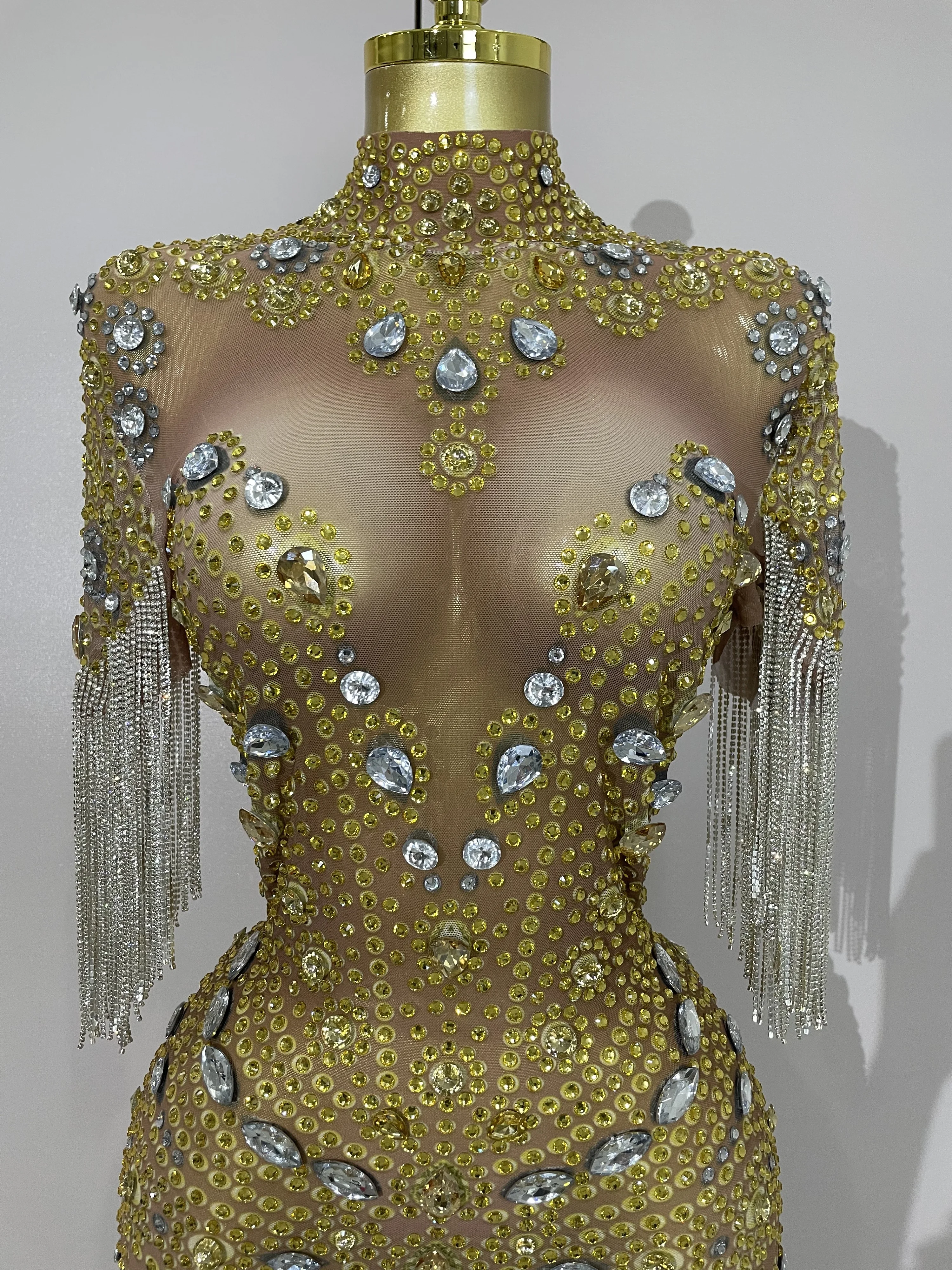 Luxo brilhante diamantes borla sexy malha ver através do vestido 2025 feminino noite celebrar festa de aniversário palco photoshoot traje