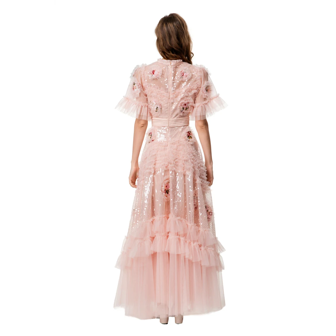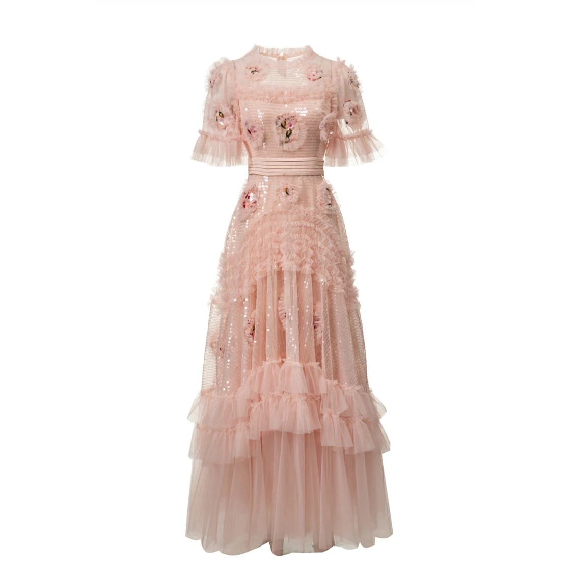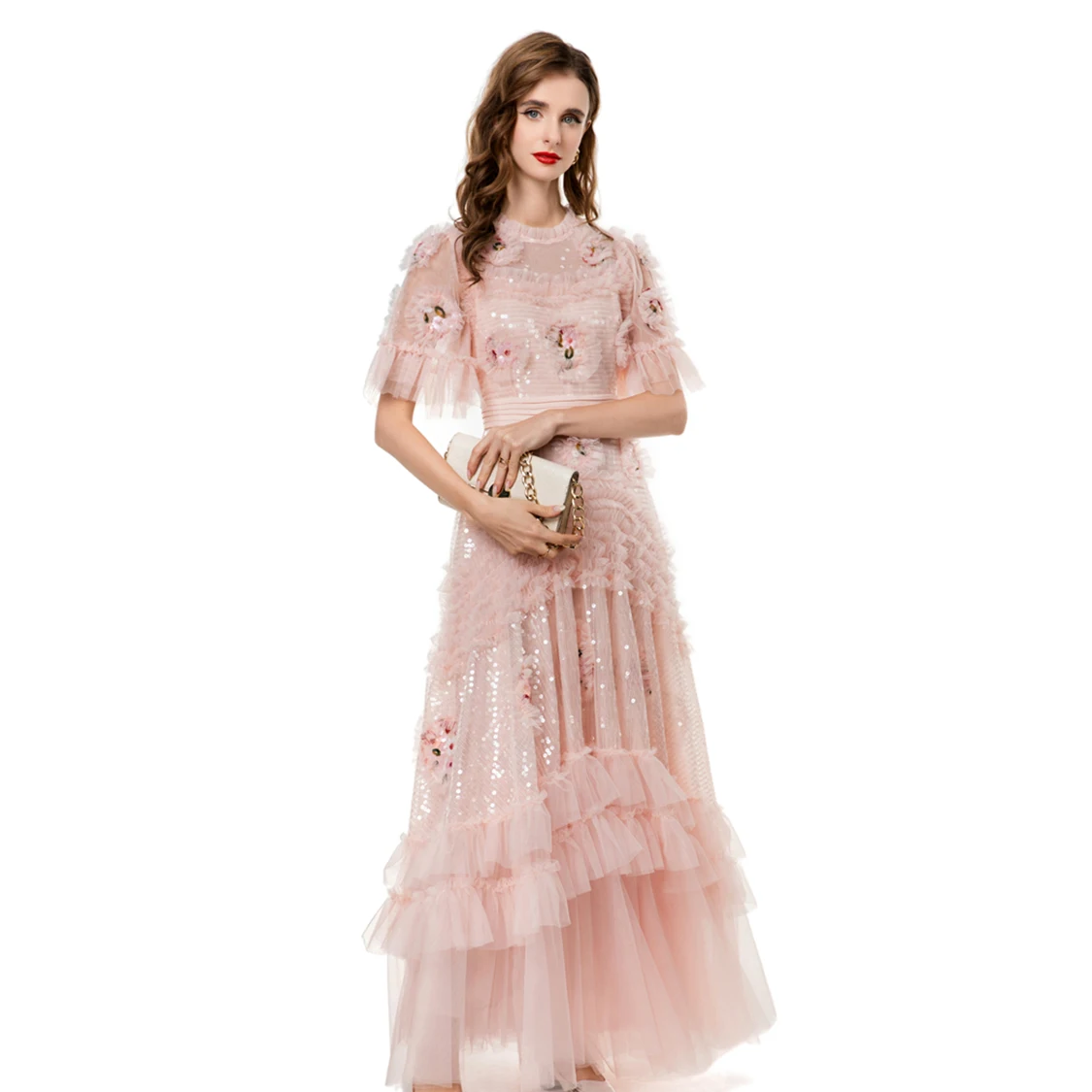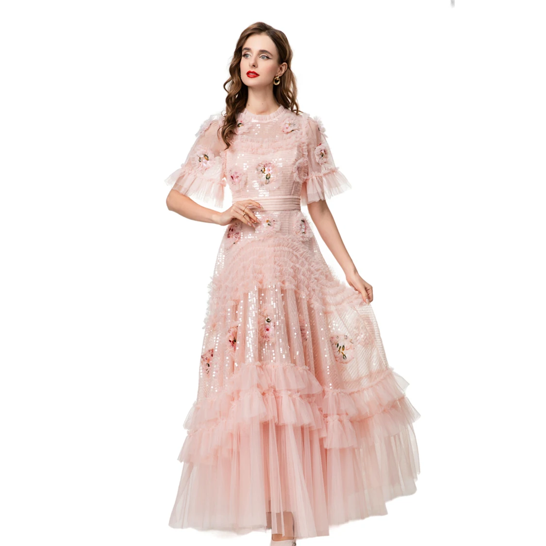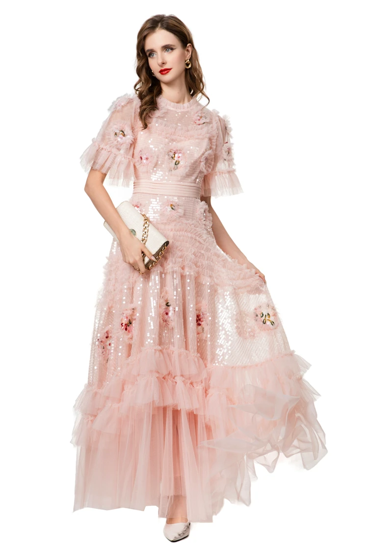 Vestidos Femininos Elegantes com Decote Redondo, Mangas Curtas, Apliques de Flores, Rendas em Camadas, Patchwork, Tamanhos S M L XL XXL 4XL