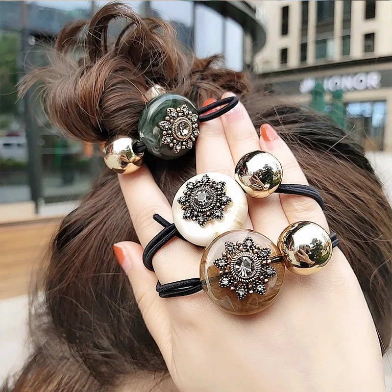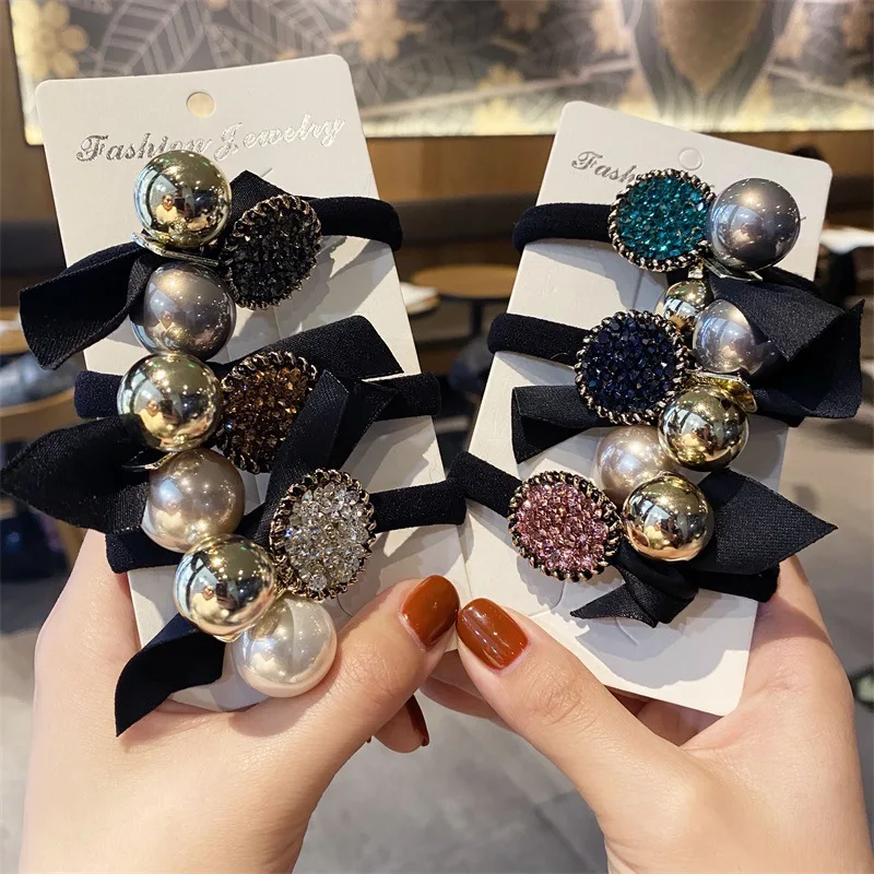 Korea Rhinestone Pearl Hair Accessories Elastic Hair Bands Luxury Colored Crystal Bow Hair Ties Ropes Ponytail Holders Wholesale