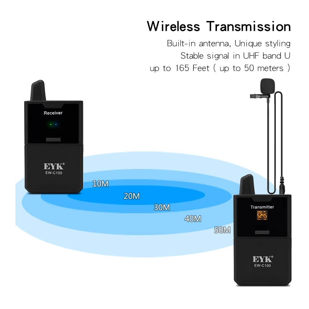 EYK EW-C100 Camera Mic Wireless Lavalier Microphone with Monitor Function UHF Wireless Lapel Mic for Smartphones DSLR Cameras