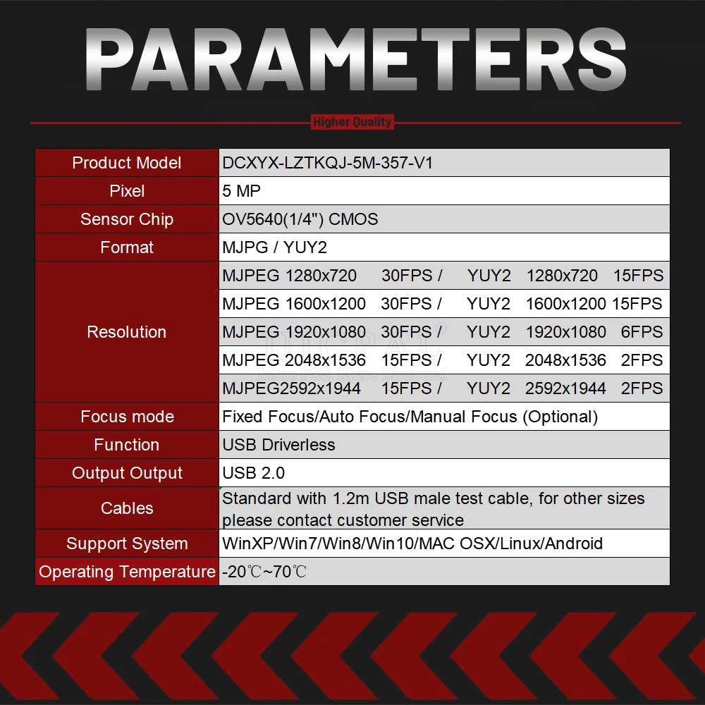 It uses the OV5640 1/4" CMOS chip, with a maximum HD resolution of 1600*1200 at 30FPS in MJPEG format.