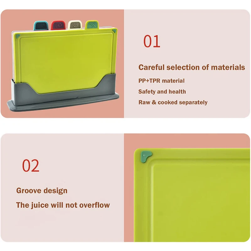LMETJMA 4Pcs Color-Coded Plastic Cutting Board Set with Storage Stand Thicker Chopping Board Set Slip-Resistant Design JT114