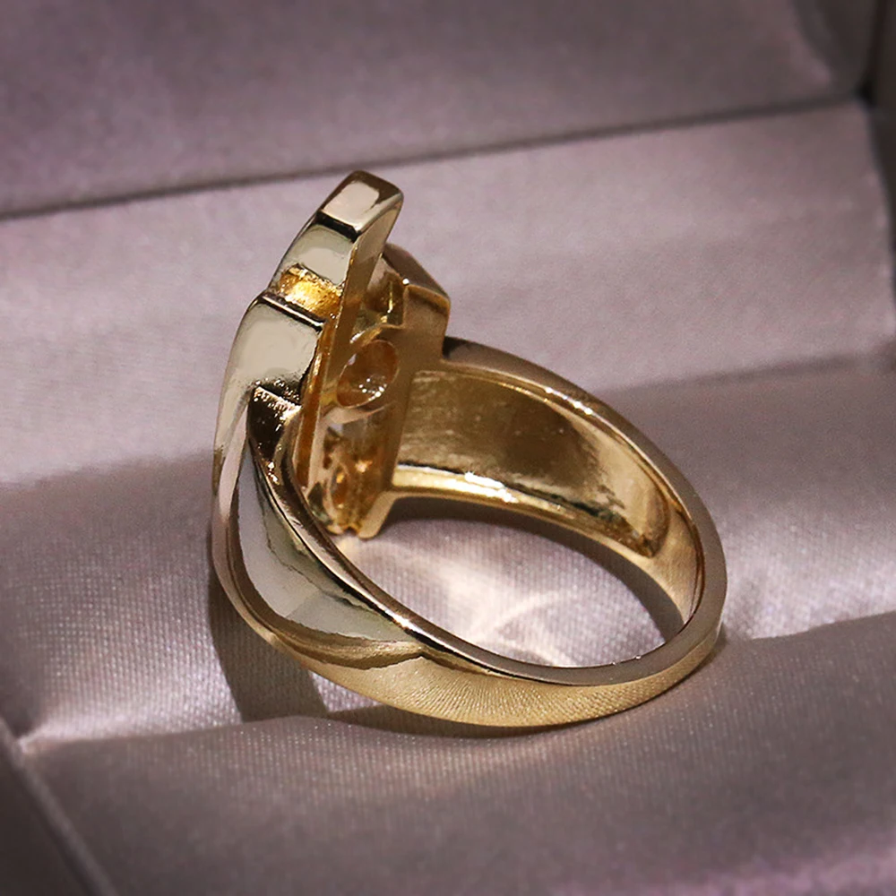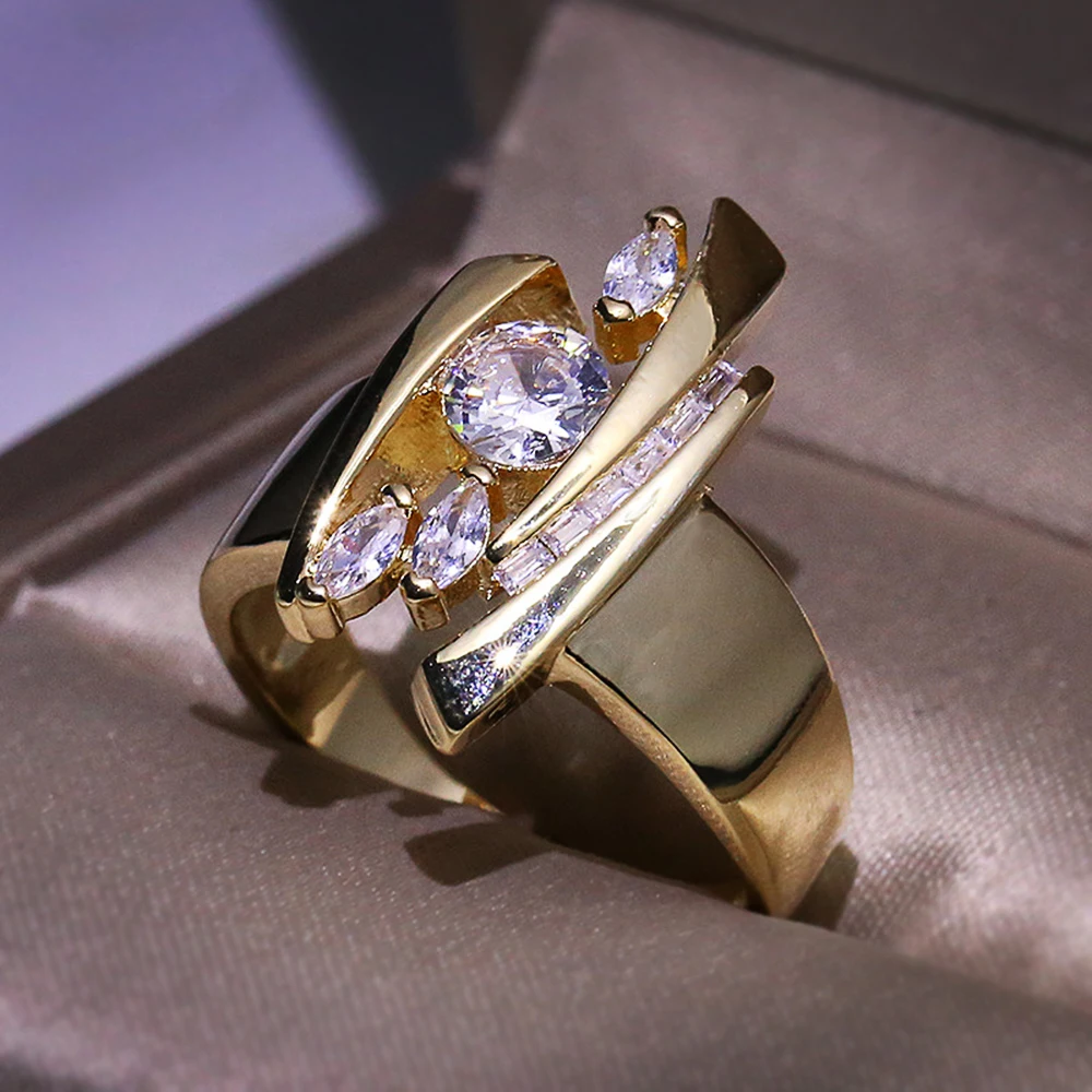 Huitan Luxury Gold Color Geometric Shape Women Rings Hiphop Party Stylish Female Finger Rings Dazzling CZ Lady's Fashion Jewelry