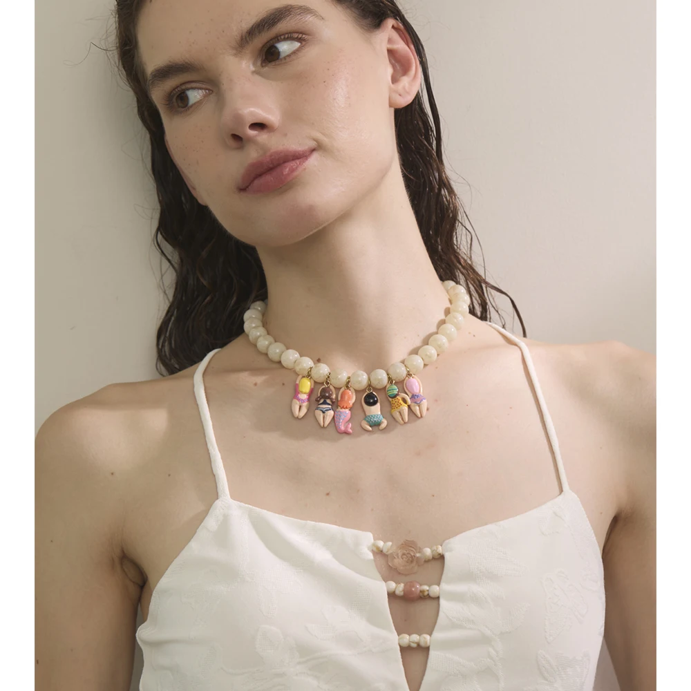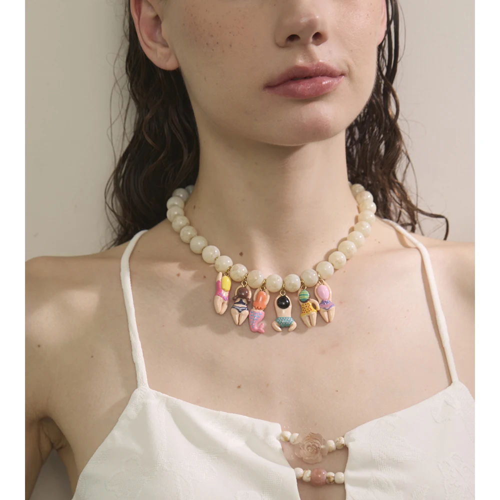 Yhpup Stylish Unique Handmade Jewelry Glass Imitation Stone Beads Chain Resin Bikini Doll Drop Creative Necklace Accessories