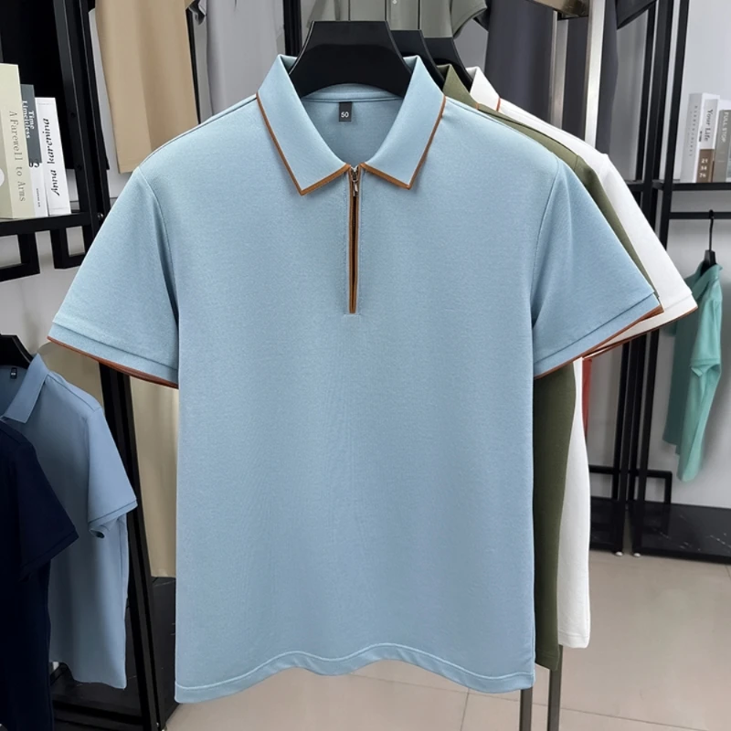 Men's Silk Zipper Polo Shirt Short Sleeve Mulberry T-Shirt Metal Zipper, Stand Collar Luxury Casual Summer Top Cotton&Linen Tee