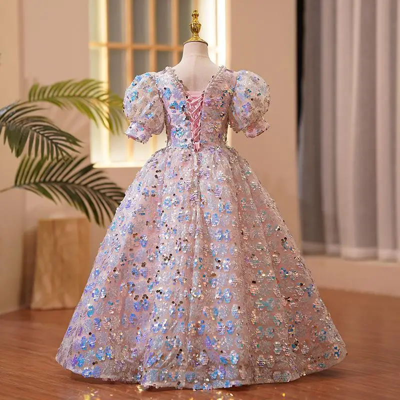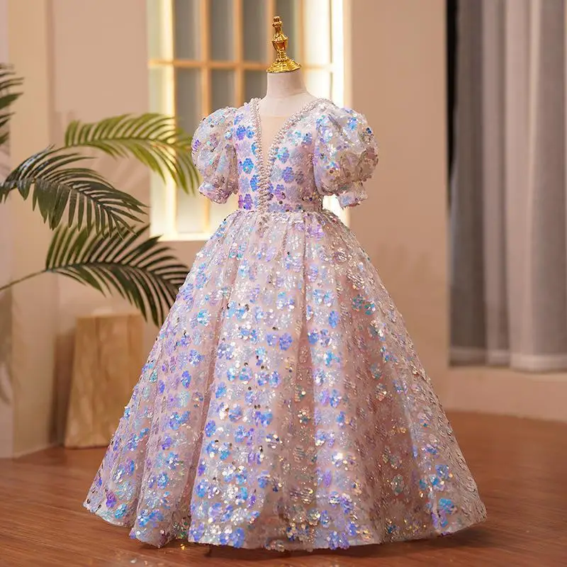 Girls' Sequin Floral Ball Gown, Puff Sleeve V - Neck Princess Dress for Pageant Party, Elegant Formal Kids' Evening Wear