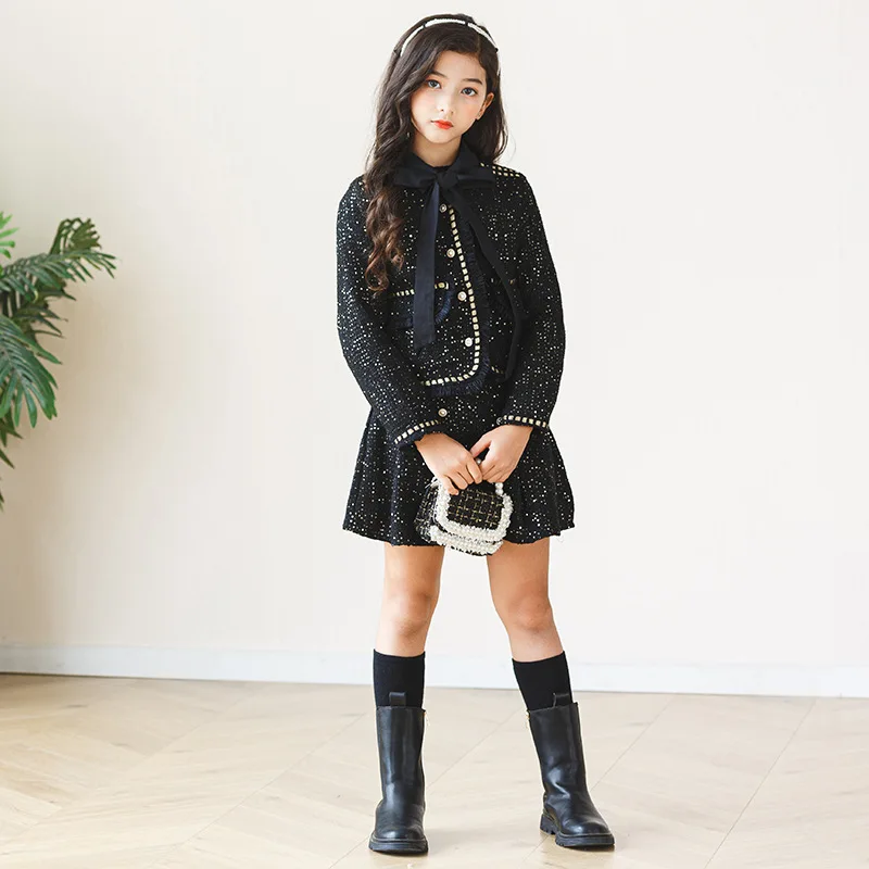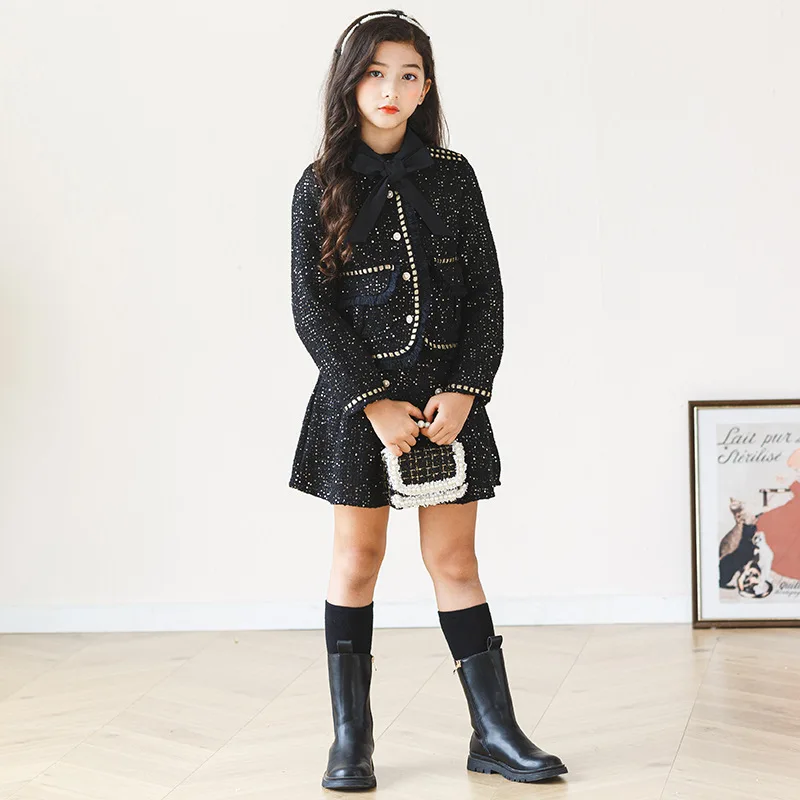 KIDWHXR Autumn Winter Children Girls 2-piece Dress Set School Girl Bright Diamond Tweed Jacket+Pleated Skirt Set For 4-14Y Girls