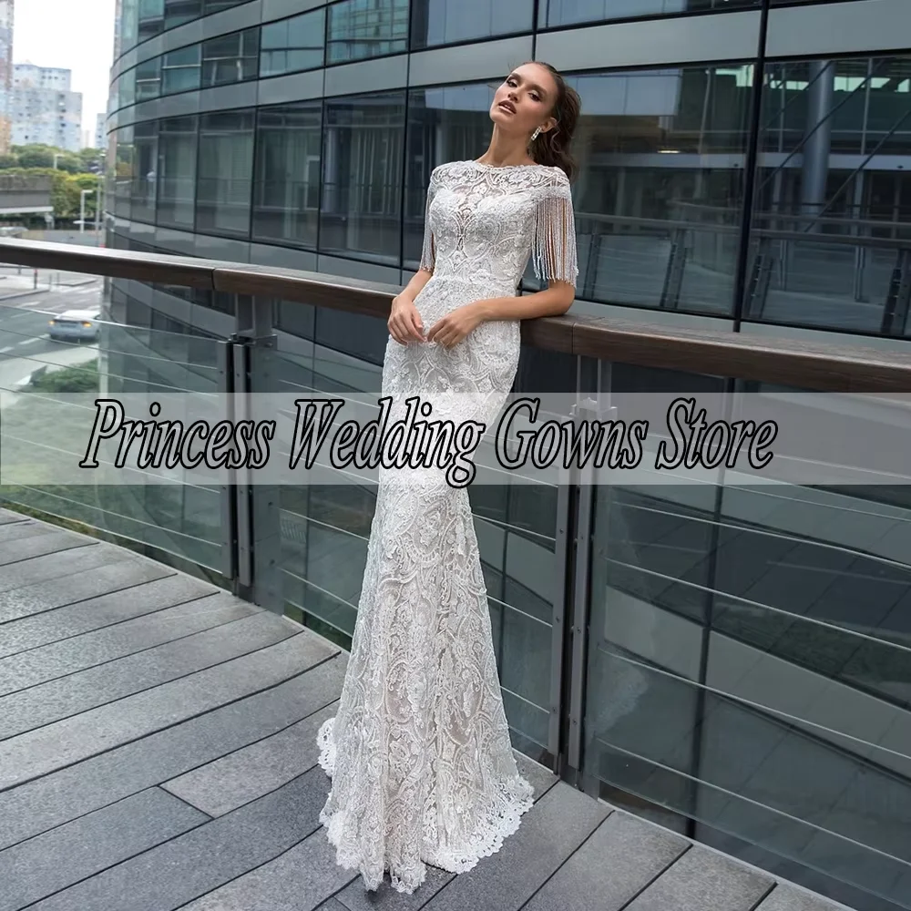 Customized White A-Line Prom Dresses Floor-Length O-Neck Sleeveless Evening Gown Fashion Lace Draped Tassel Sexy Backless